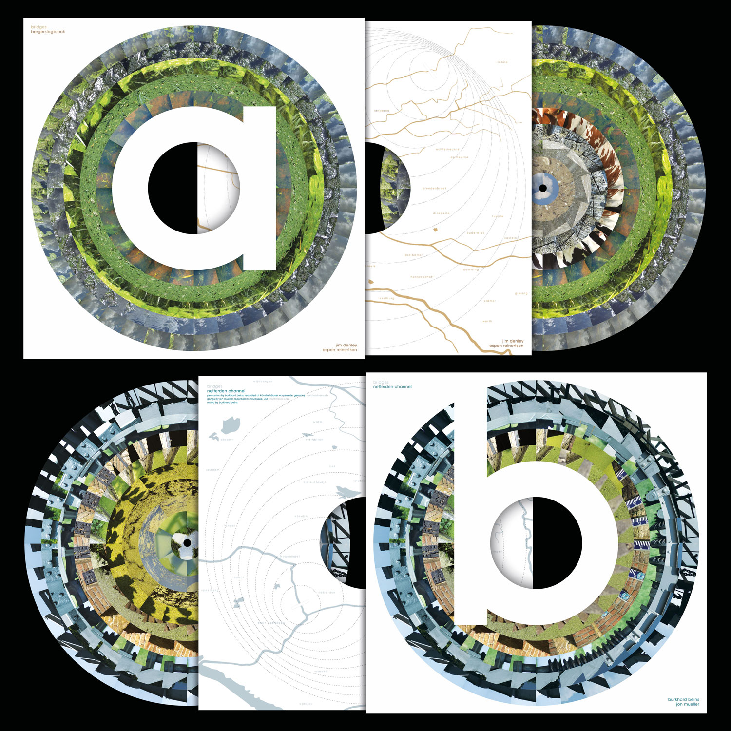 Machinefabriek, aka Rutger Zuyderfelt, has co-curated this bridge-themed compilation with visual artist Gerco Hiddink, bringing together eight musicians (four pairings of two) across its four lavishly decorated sides, lovely spinning zoetropes all. each pairing were given recordings made on location at four different bridges in the Netherlands to which they were to react independently, and the results were then mixed together. they were, if you like, building the same bridge, but from opposite ends, only able to guess at what was going on at the other side, and hoping they would meet in the middle. and with a little luck, some sound creative instinct, and a bit of help in the mixing, they have pulled it off: the constructions are not just stable enough to bear weight, but enjoyable to cross. the musicians recruited into this project have reacted in interesting, different and complementary ways to the source materials.