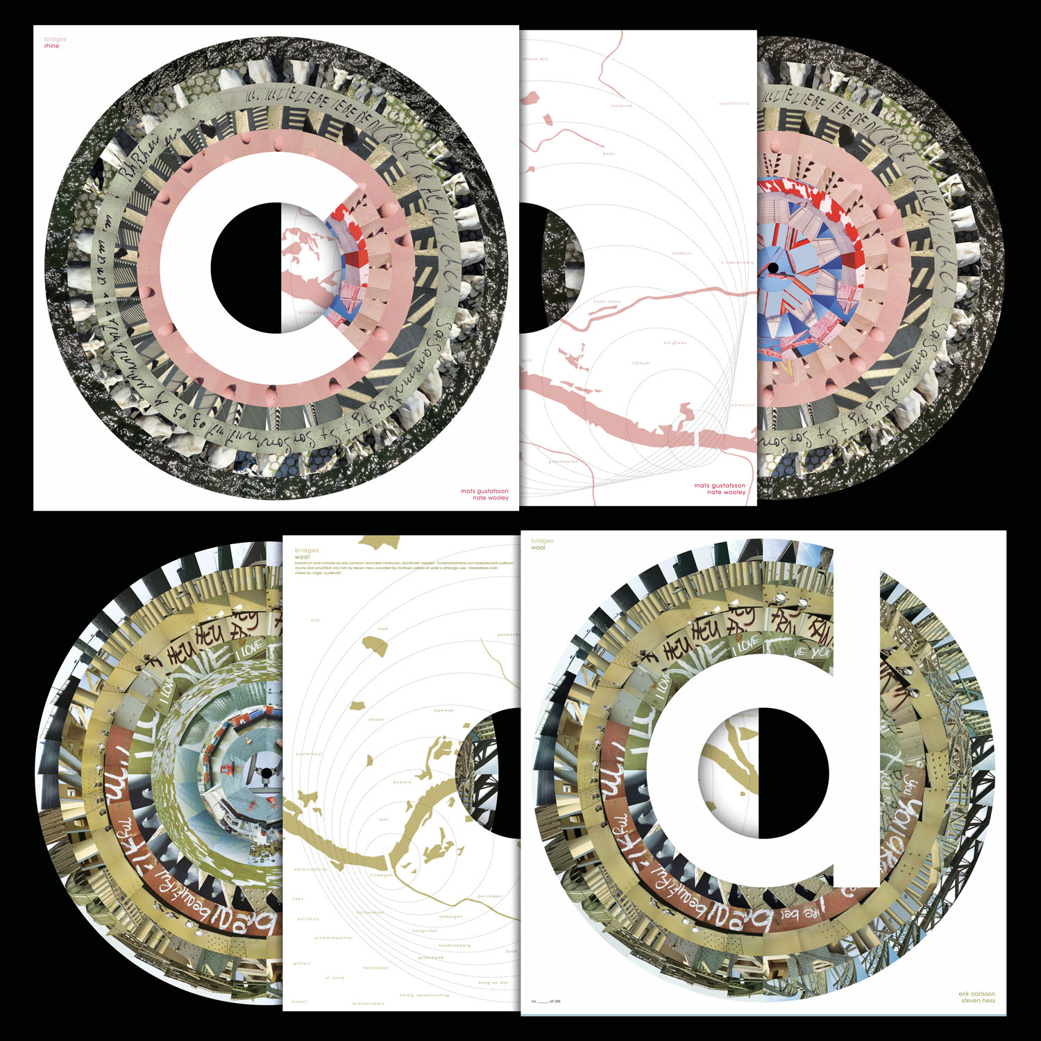 Images of this album have been shown around Facebook, Twitter and such like, and already met great acclaim and indeed: what a cover! So, what is it? Not easy to tell. Rutger Zuydervelt, the fabriek that is a machine, recorded four different bridges between Sinderen and Nijmegen (ho! ho!) in the Netherlands, along with visual material by designer Gerco Hiddink. He created a great visual work, which is displayed on the cover but also on the two picture discs themselves. A great visual thing. The field recordings were then passed onto eight musicians, all from the world of improvisation and asked to improvise along with the material and send it to Zuydervelt, who then mixed all of it together, in pairs of two players at a time. Quite a complicated scheme, i’d say, but the result is very nice. Zuydervelt has grouped the players, so there are saxophones played by Jim Denley and Espen Reinertsen, percussion piece by Burkhard Beins and Jon Mueller, saxophone by Mats Gustafsson and trumpet by Nate Wooley, bass drum and crotales by Erik Carlsson along with drums and amplified roto tom by Steven Hess. Not always the field recordings sound: they seem almost absent on the Muller/Beins side, but do play a big role on the one by Denley/Reinertsen, and in the Carlsson/Hess piece the many cars passing the Nijmegen bridge are also considerably important. Some of this playing, on all four sides, sound like they were done together, rather than separate. Excellent work all around, some great music, excellent images, and a fine concept behind all of this. Hard to tell who did what, and that’s in this ego-world a great thing.