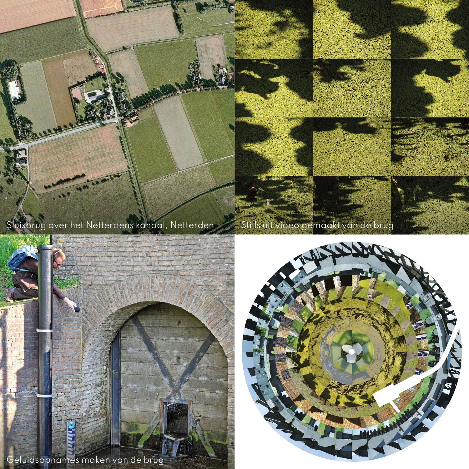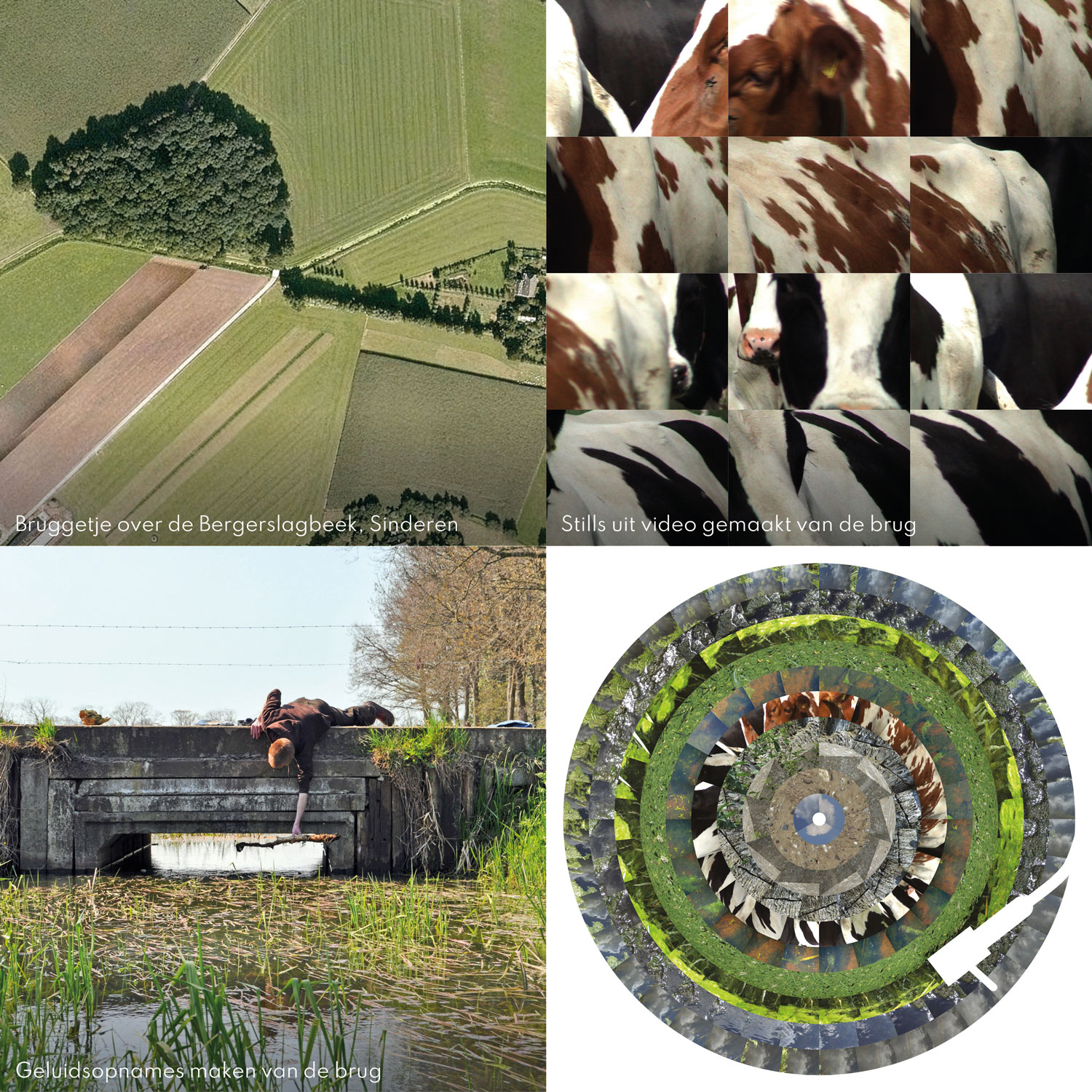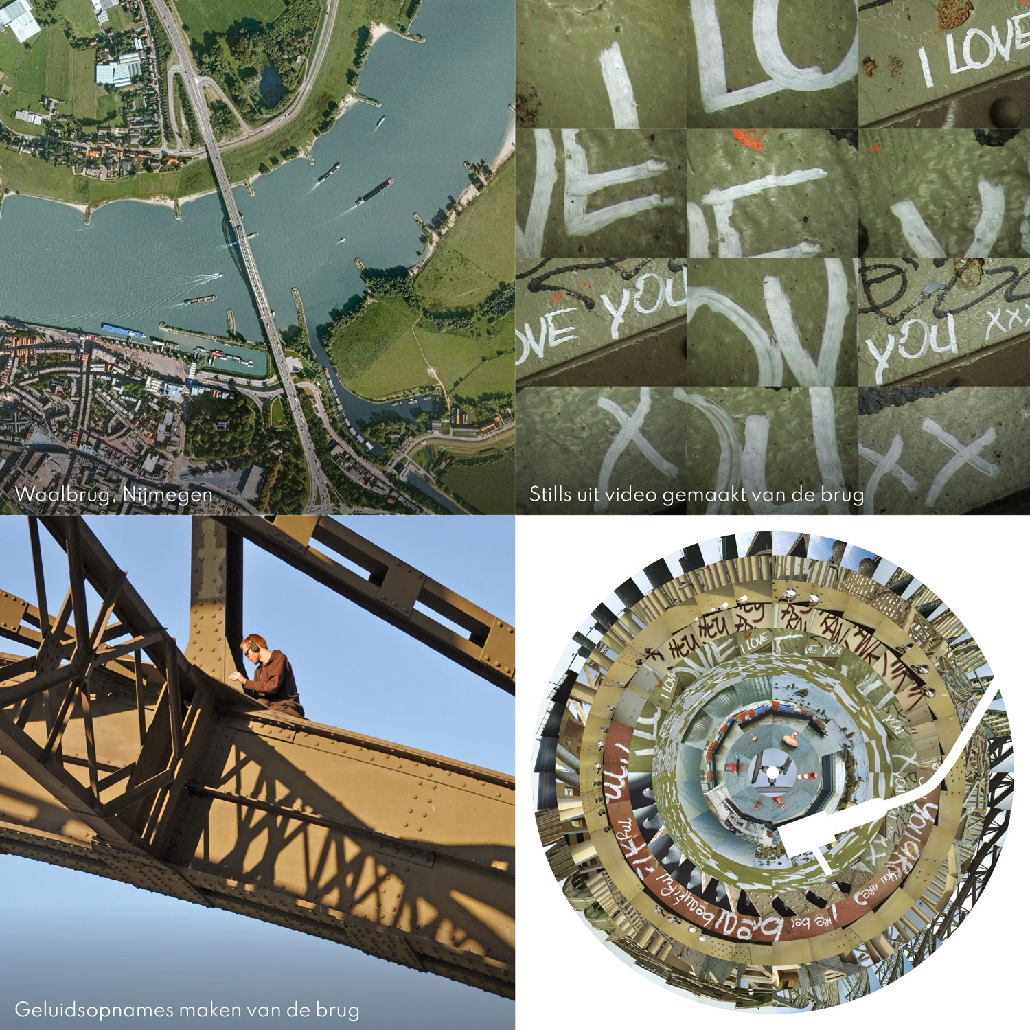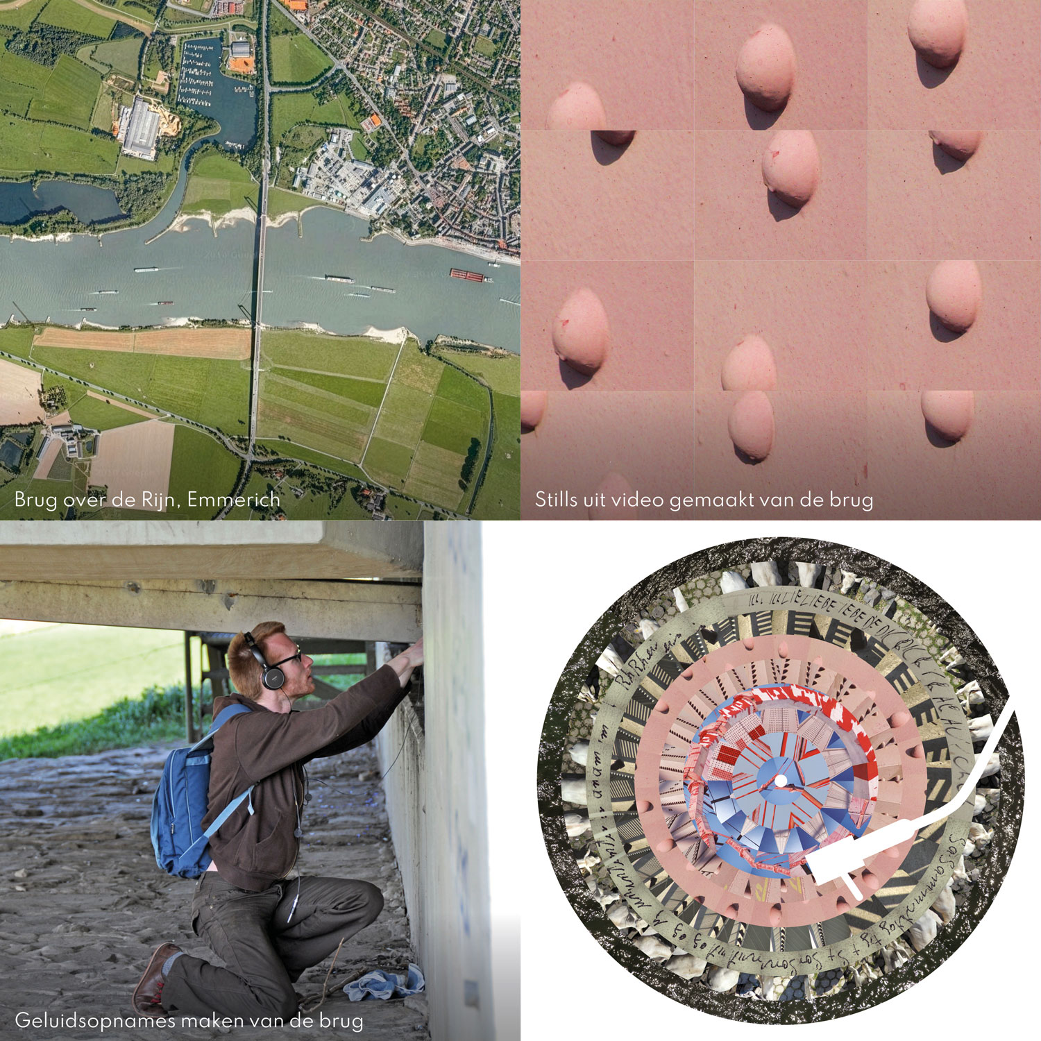 De gekozen bruggen zijn de Waalbrug bij Nijmegen, de Rijnbrug bij Emmerich, de sluisbrug over het Netterdens kanaal bij Netterden en het bruggetje over de Bergerslagbeek achter mijn geboorthuis in Sinderen. Uit de video’s die ik van deze bruggen maakte haalde ik stills die ik vervolgens als beeldsequenties in cirkels plaatste. Door deze op een picture disc te drukken zouden de beeldreeksen als animatie weer tot leven komen, als de plaat op een platenspeler wordt afgedraaid. Zoals bij een zoötroop.