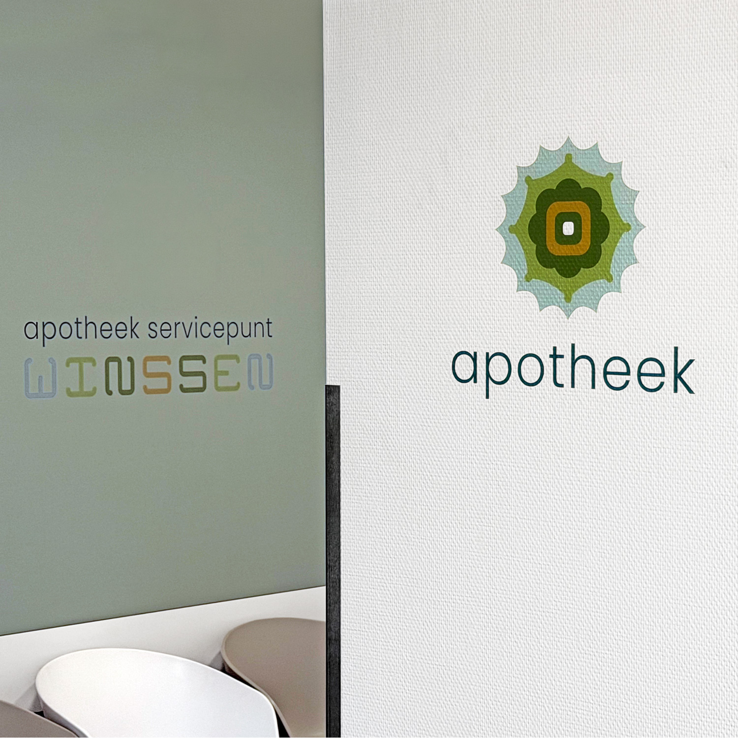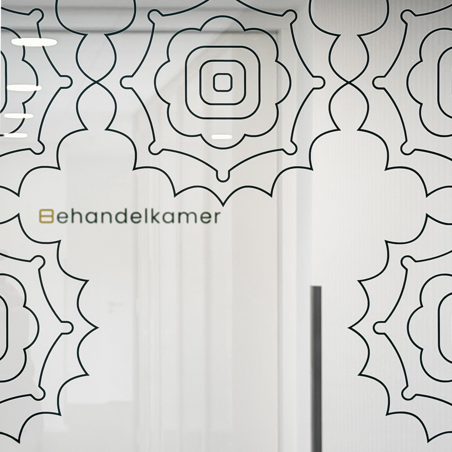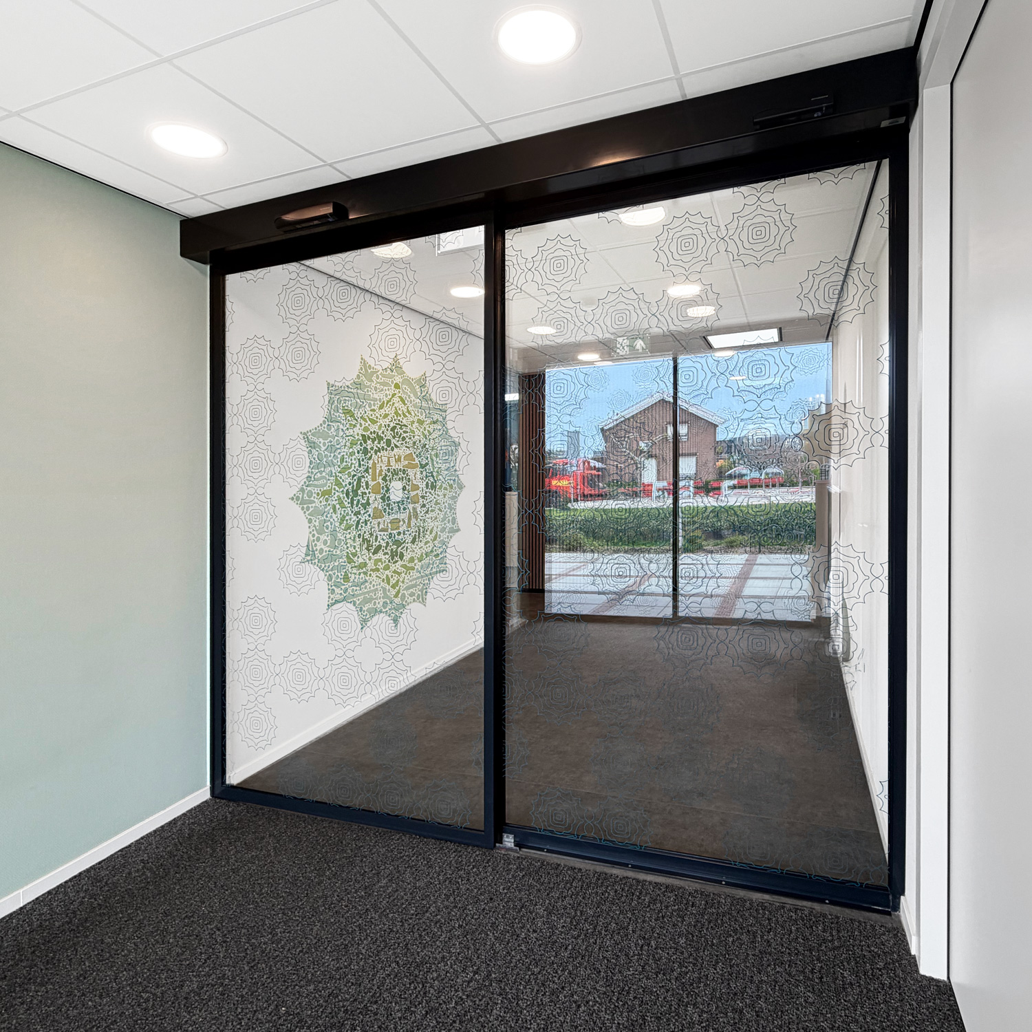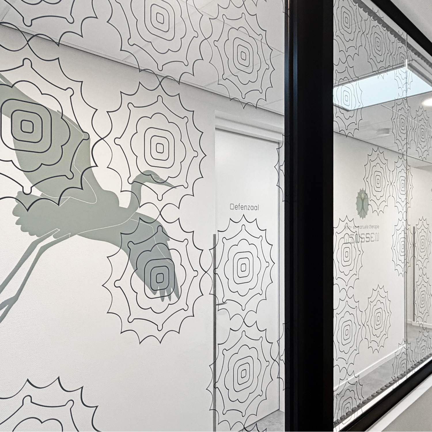 Het beeldmerk van Gezondheidscentrum Winssen is vertaald naar patronen die zijn toegepast in semi-transparante raamfolies voor privacy (op de buitenramen van het gebouw) en transparante ‘anti-bloedneusfolie’ op ramen en deuren binnen in het gebouw.