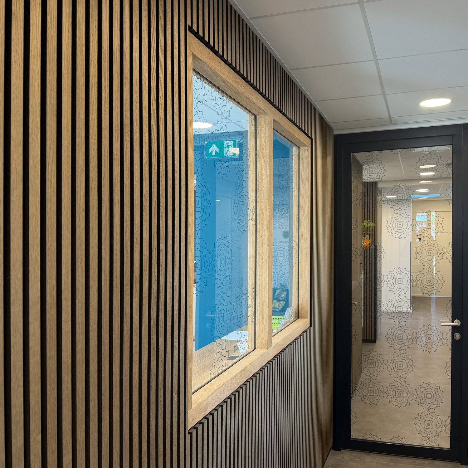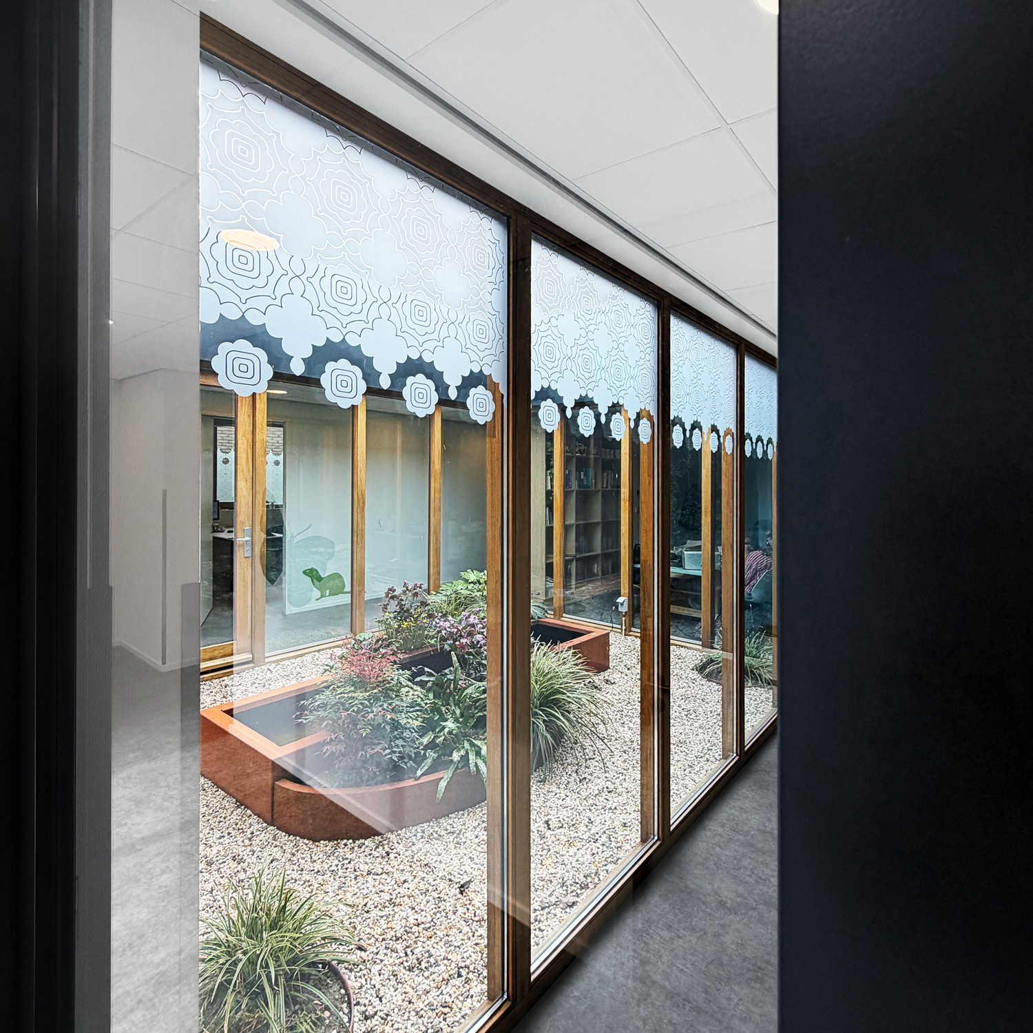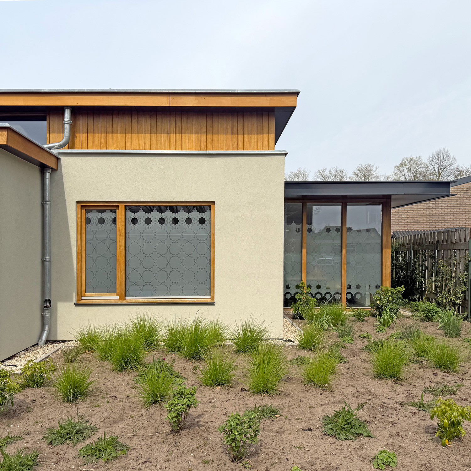 Het beeldmerk van Gezondheidscentrum Winssen is vertaald naar patronen die zijn toegepast in semi-transparante raamfolies voor privacy (op de buitenramen van het gebouw) en transparante ‘anti-bloedneusfolie’ op ramen en deuren binnen in het gebouw.