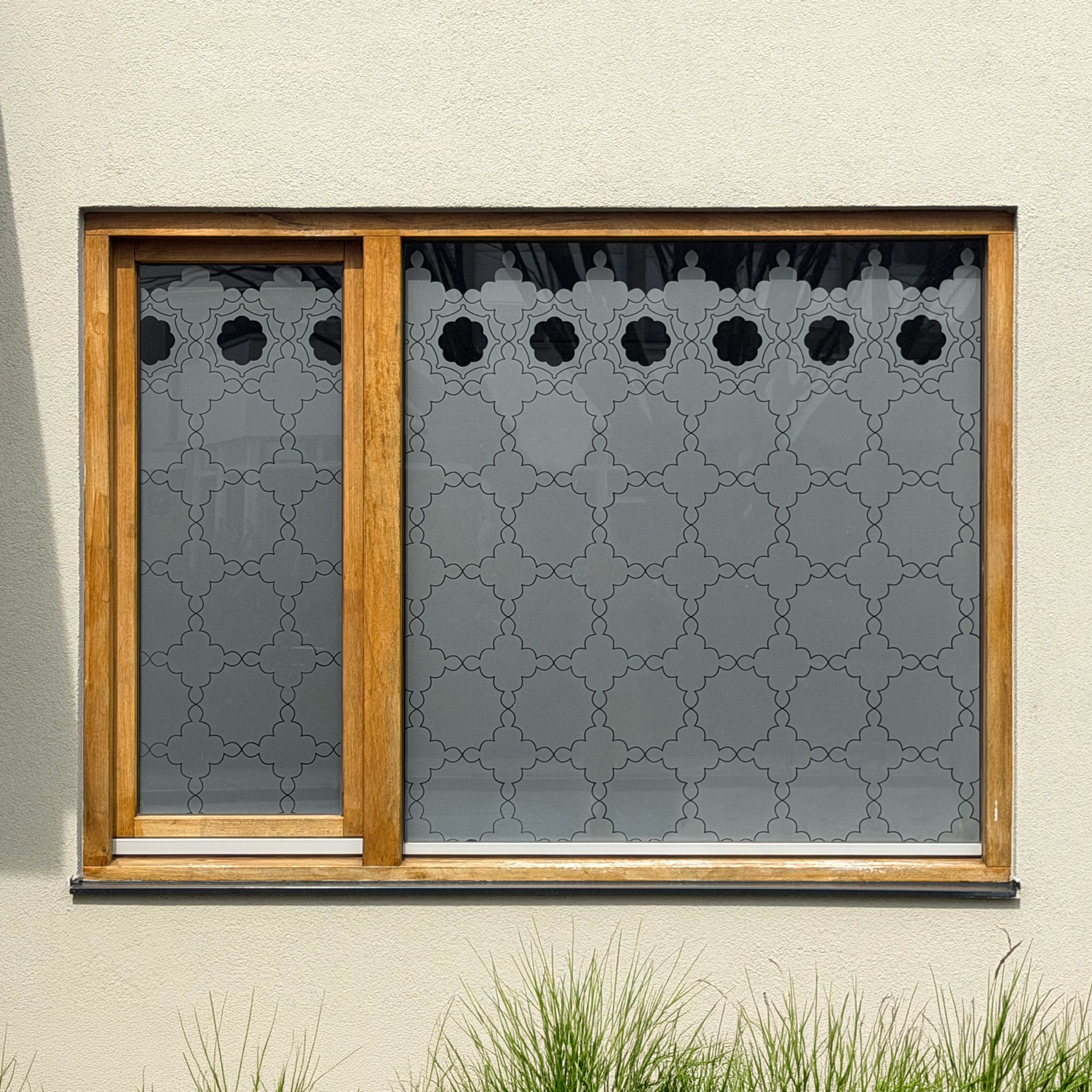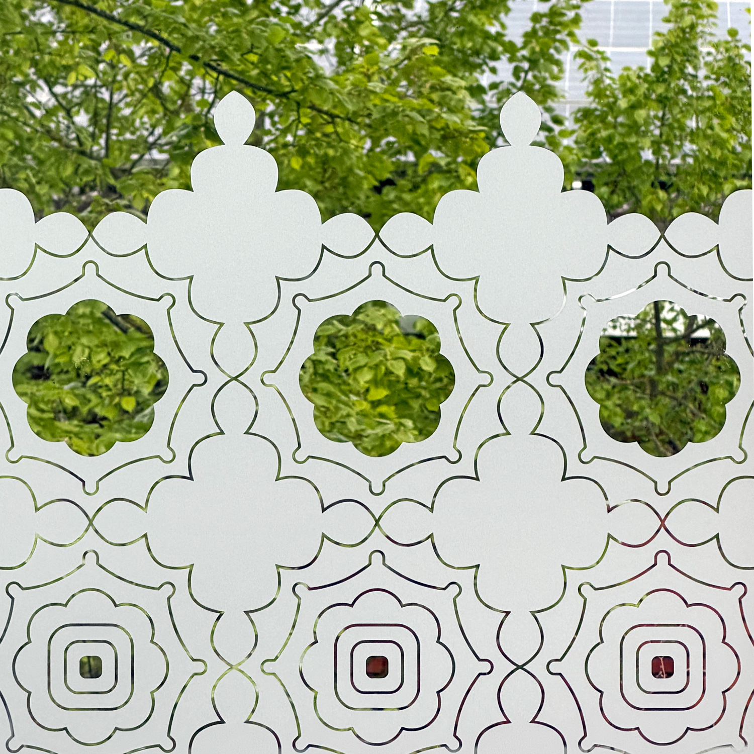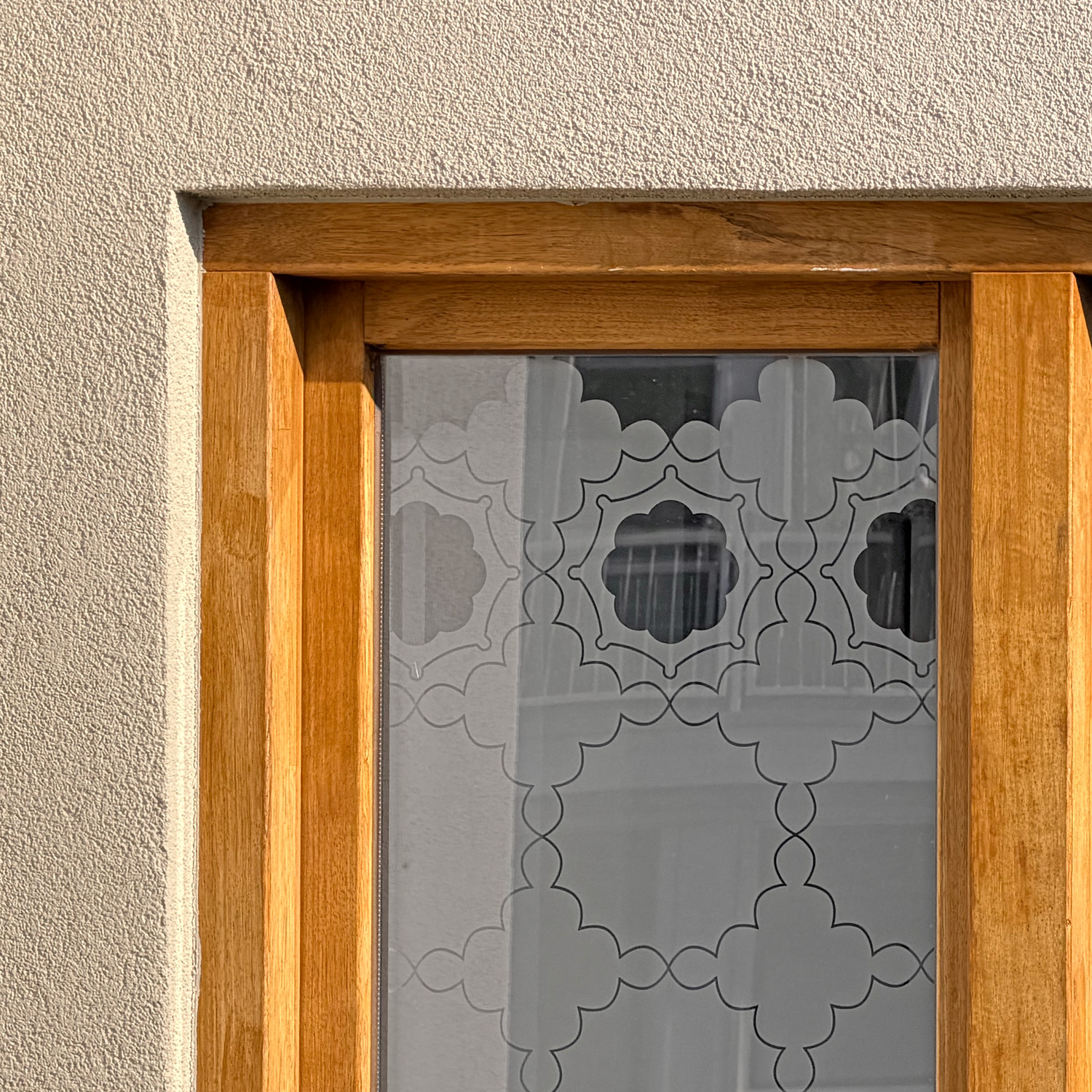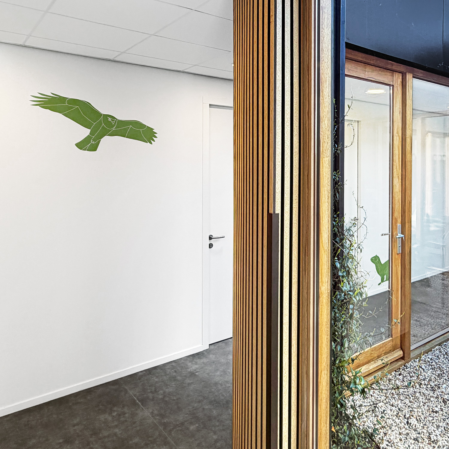 Het beeldmerk van Gezondheidscentrum Winssen is vertaald naar patronen die zijn toegepast in semi-transparante raamfolies voor privacy (op de buitenramen van het gebouw) en transparante ‘anti-bloedneusfolie’ op ramen en deuren binnen in het gebouw.