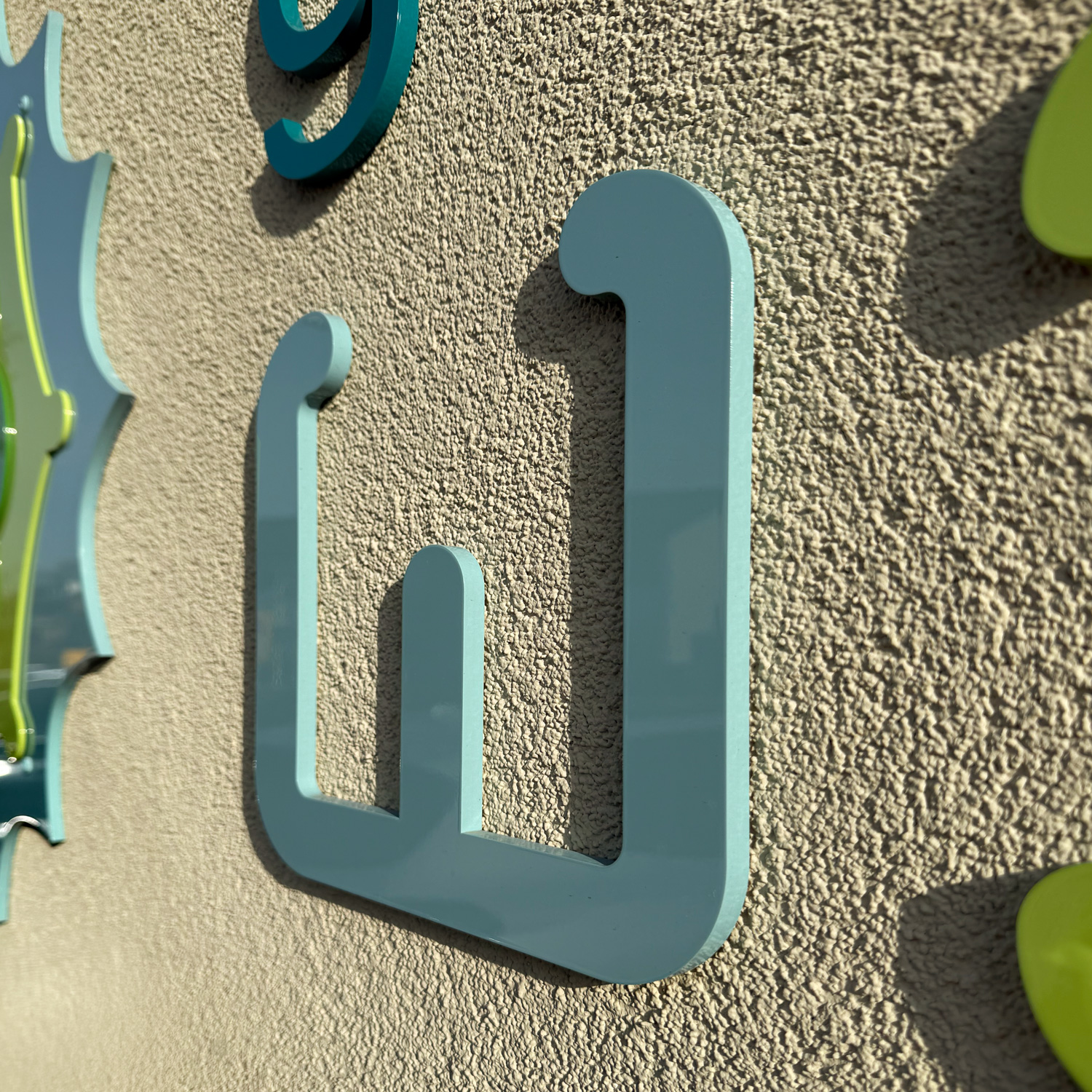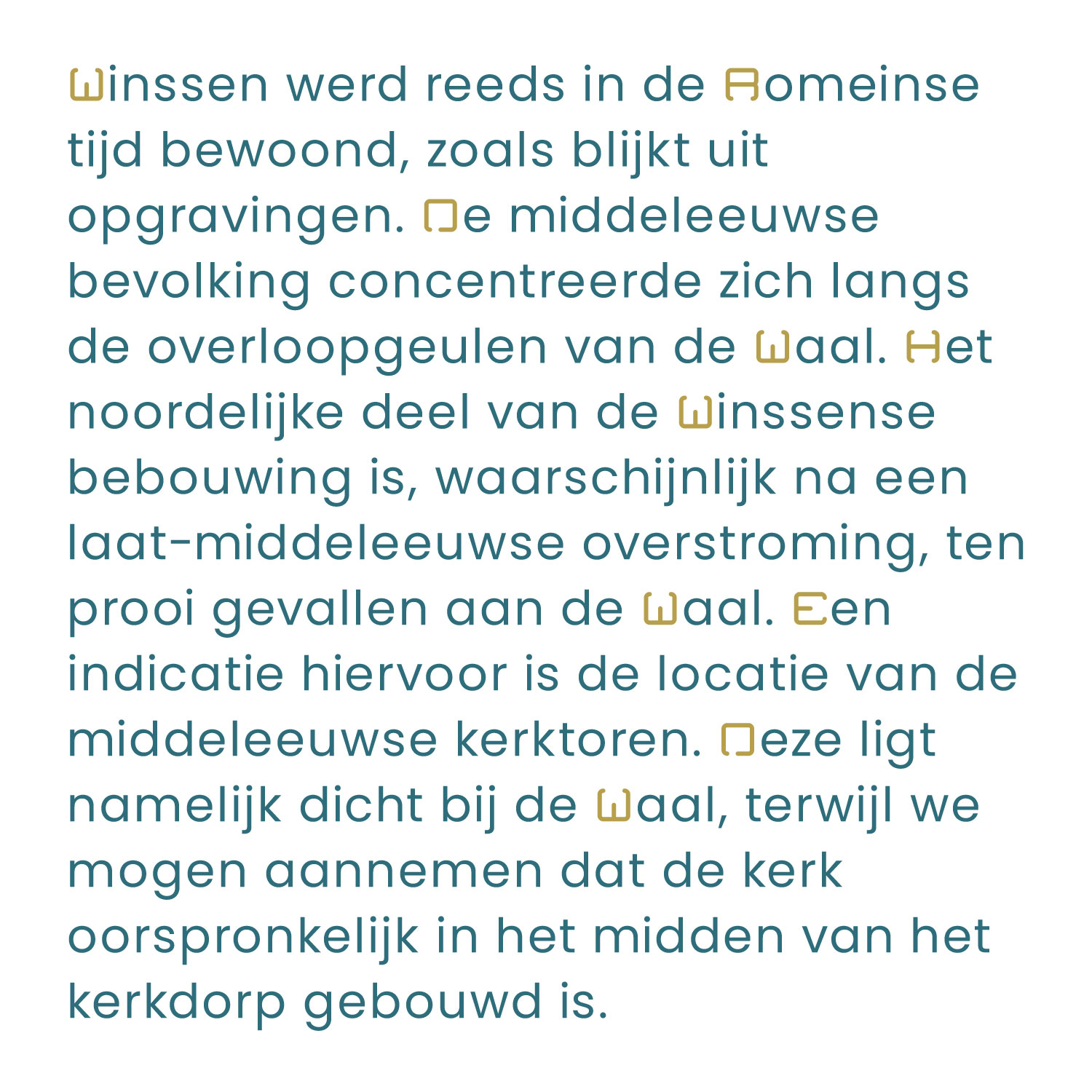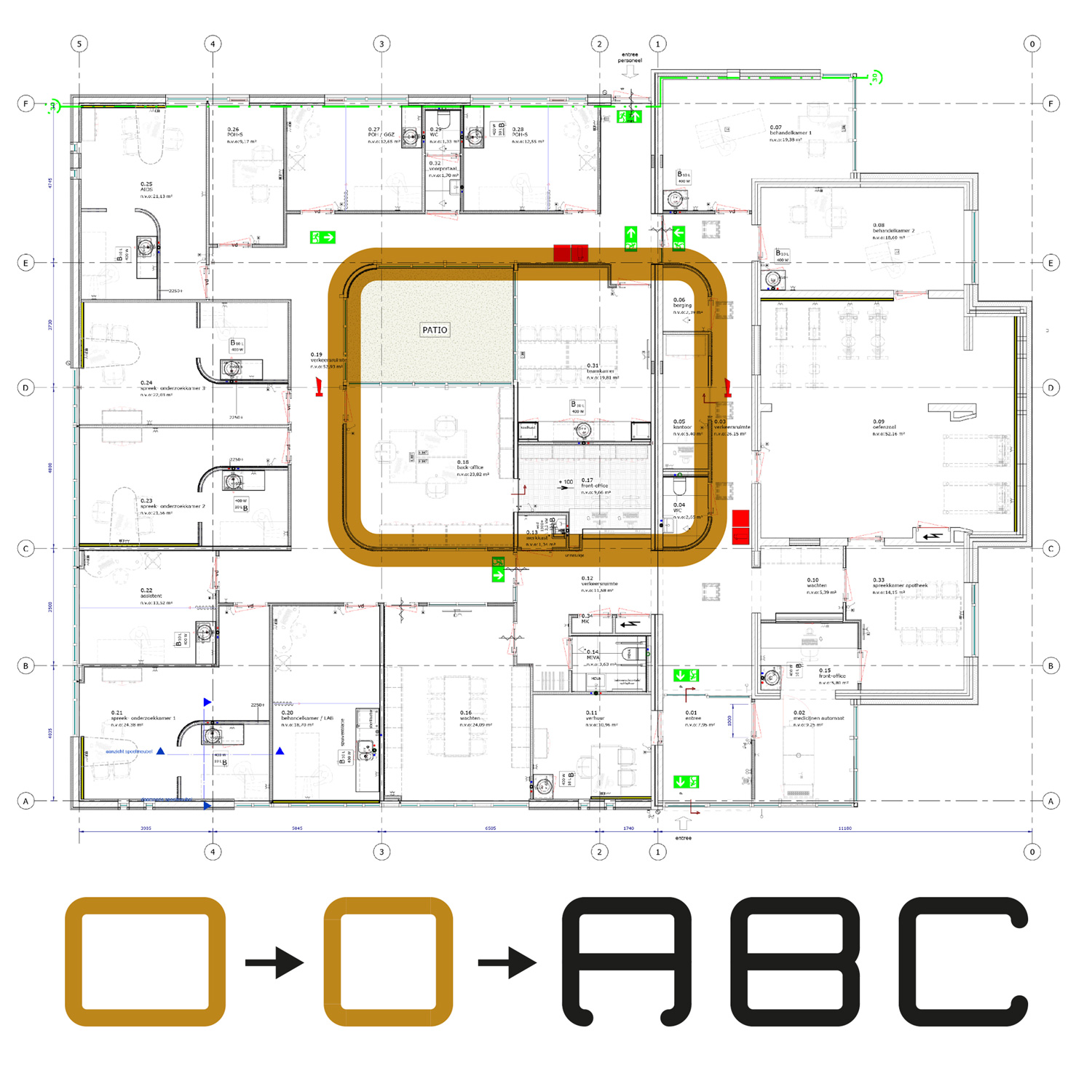 De patio met de afgeronde hoeken vormt de basisvorm voor de letters van ‘Winssen’ in het logo. Dit is doorontwikkeld naar een werkend lettertype dat o.a. is toegepast in de routing van het gebouw.
