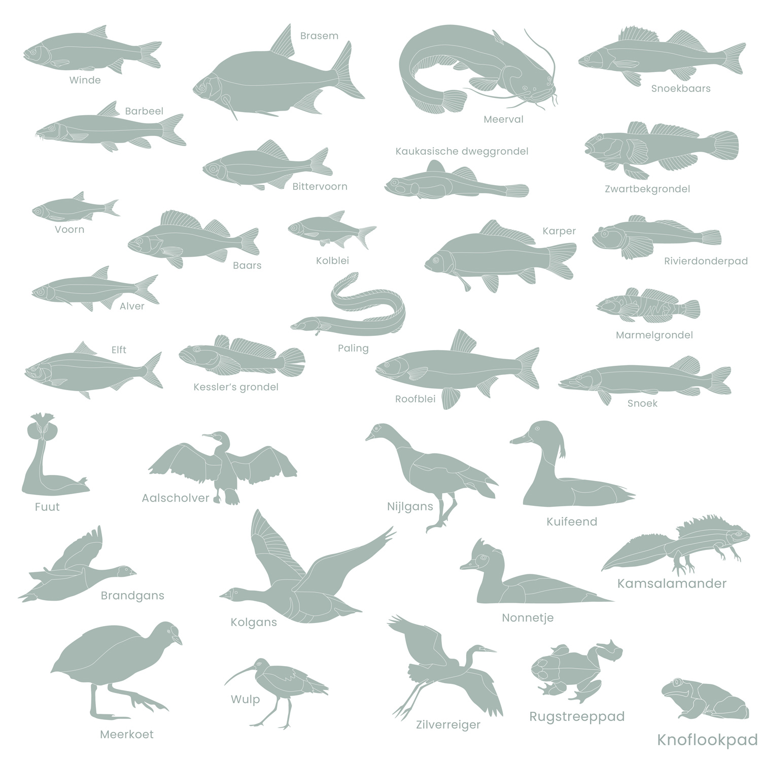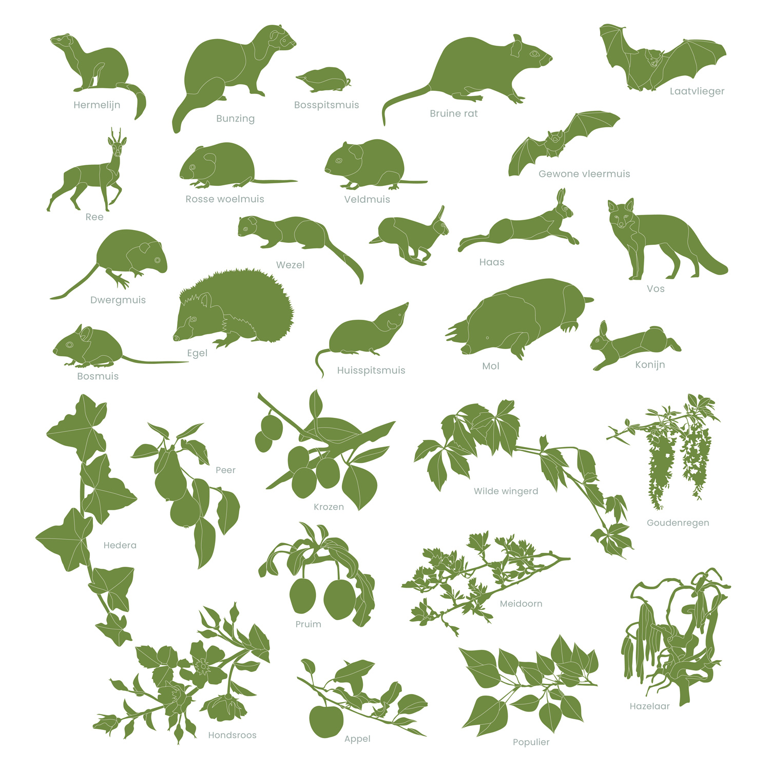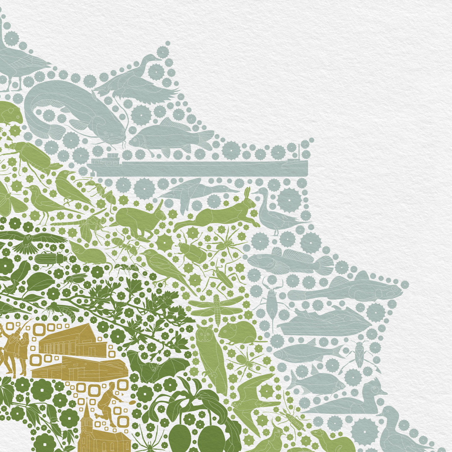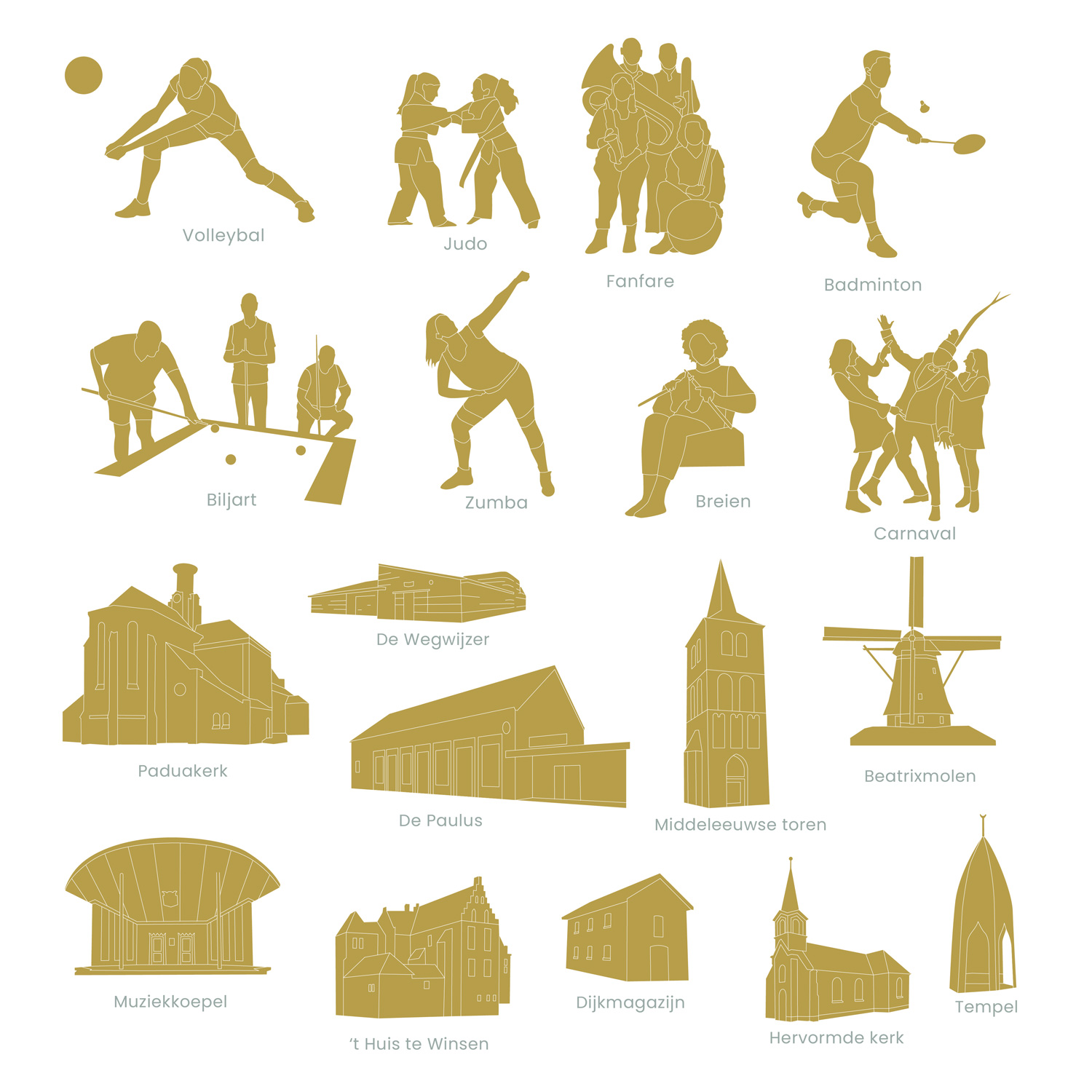 Voor de visuele identiteit van Gezondheidscentrum Winssen ontwikkelde Studio Hartebeest een grote reeks illustraties: planten, dieren, gebouwen en menselijke activiteiten die kenmerkend zijn voor Winssen en omgeving. Deze komen op verschillende plaatsen terug in het interieur.