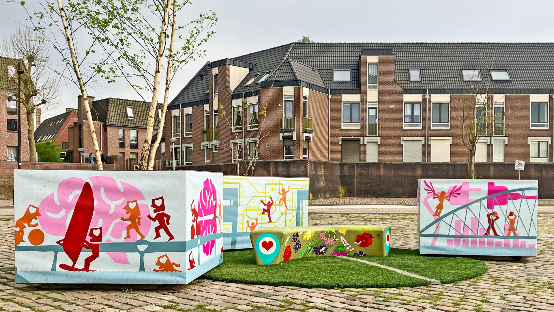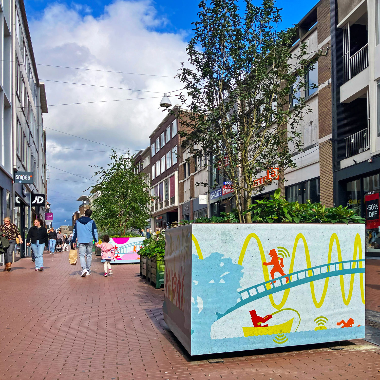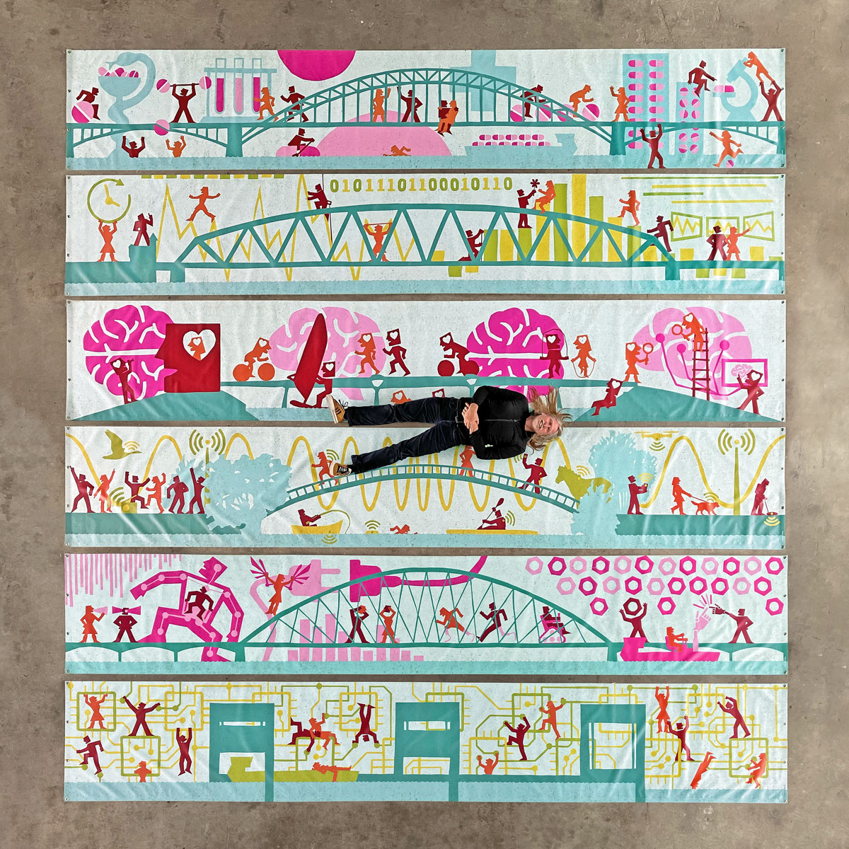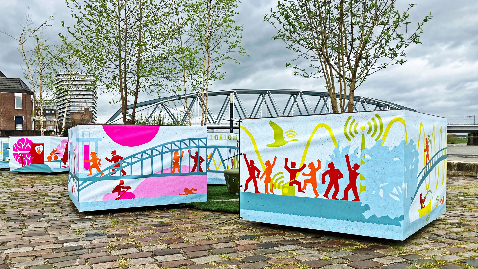 Ze reisden meer dan een jaar door het centrum van Nijmegen: de wandelende plantenbakken die meer groen in de stad aankondigen. Gemeente Nijmegen vroeg Studio Hartebeest om 6 spandoeken te ontwerpen in het thema ‘Health & Hightech’ (twee belangrijke economische thema’s van Nijmegen). Zes Nijmeegse bruggen verbinden de thema’s op een speelse manier met elkaar.