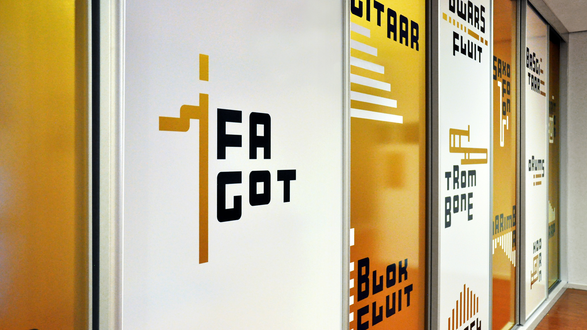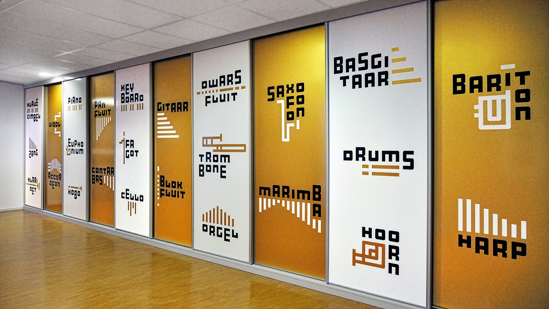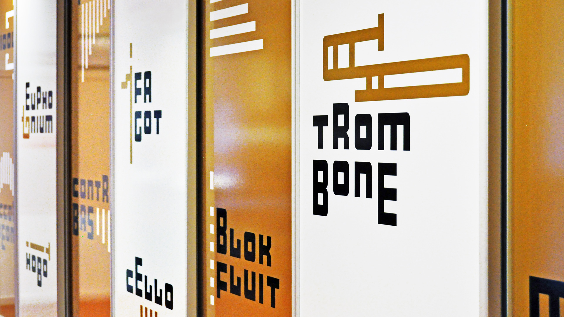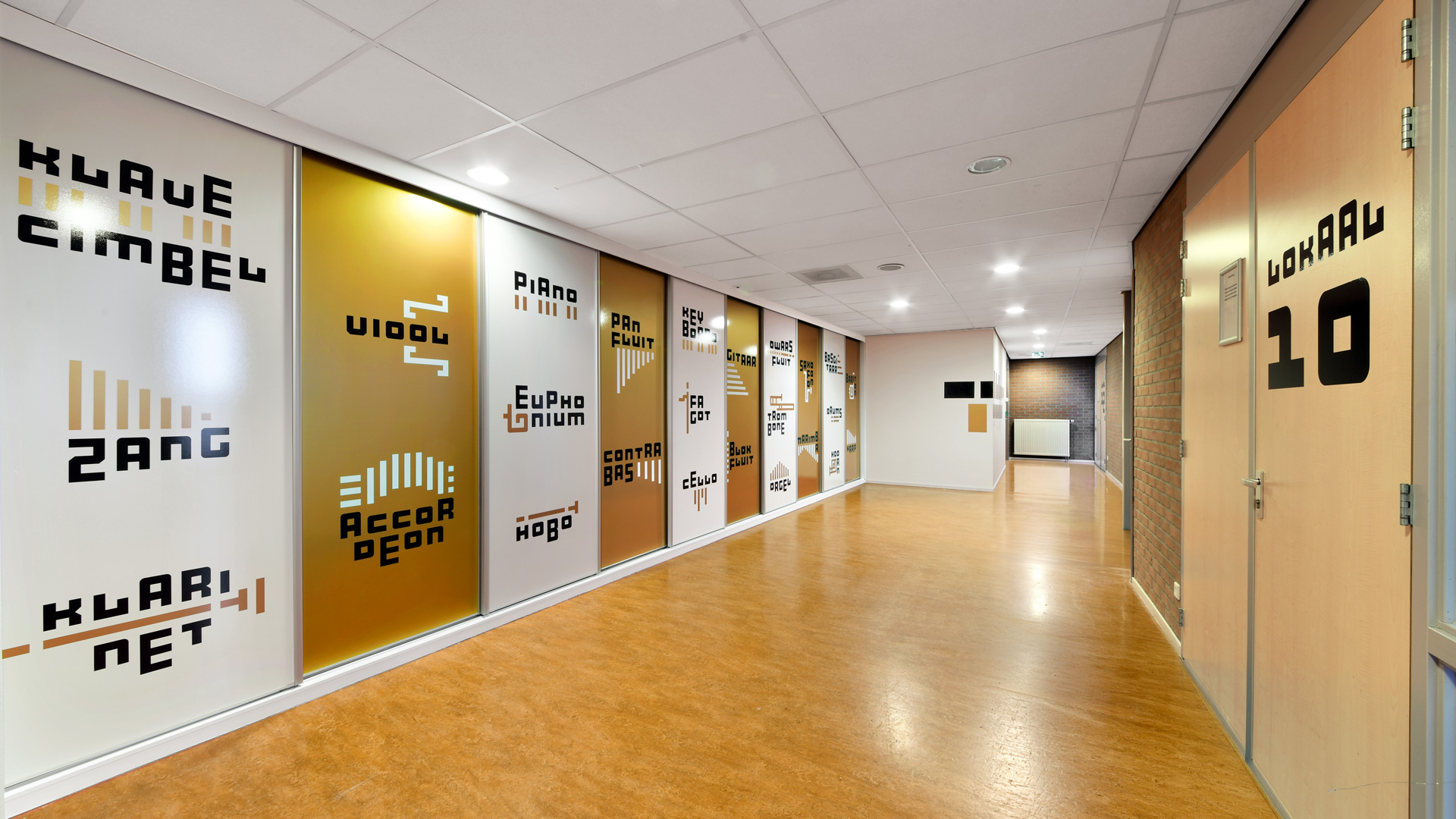 De huisstijl werd vervolgens doorgetrokken in het interieur van de muziekschool: een heldere en uitgesproken bewegwijzering aangebracht op deuren en muren, wc-deuren in de gouden huisstijlkleur met bijpassende iconen, bekleding in een bijpassende kleur. Op verschillende plekken komt de abstracte basisvorm van het logo terug, die doet denken aan een equalizer.
