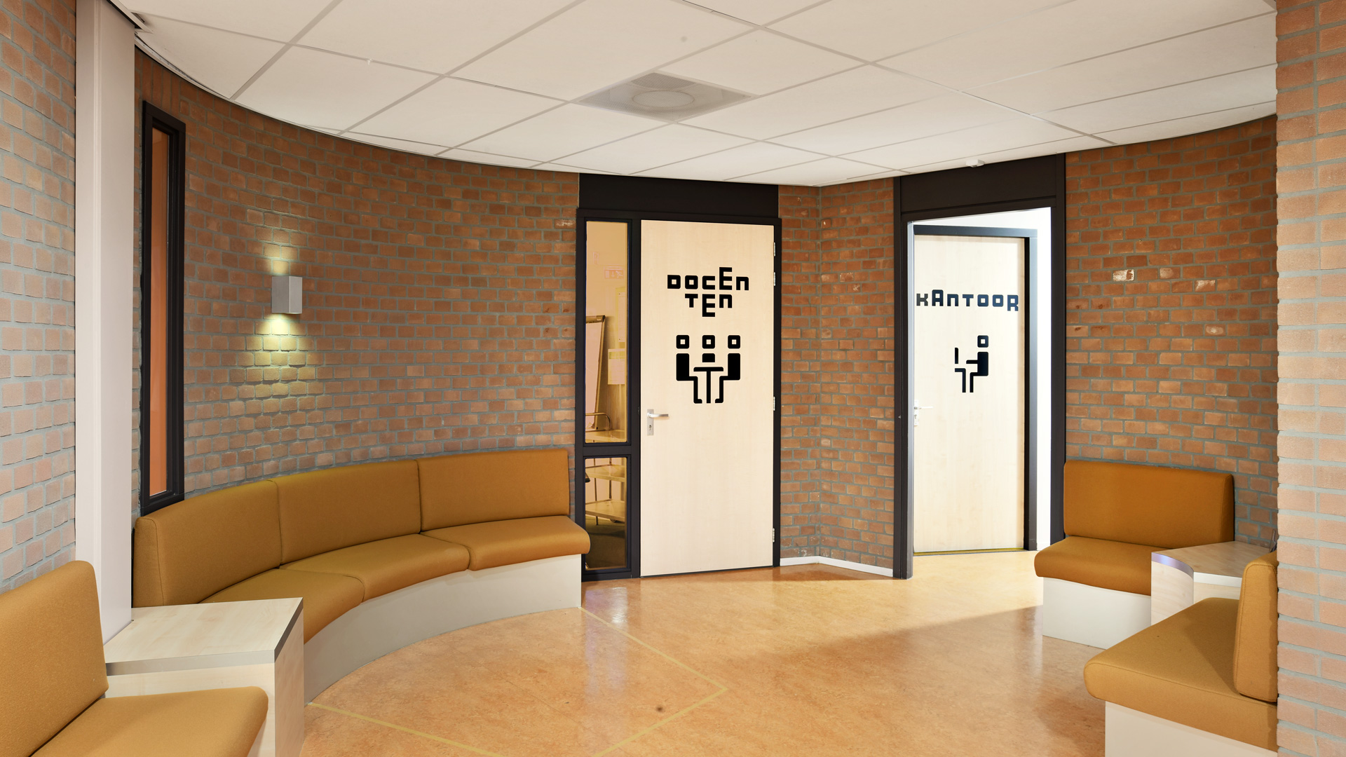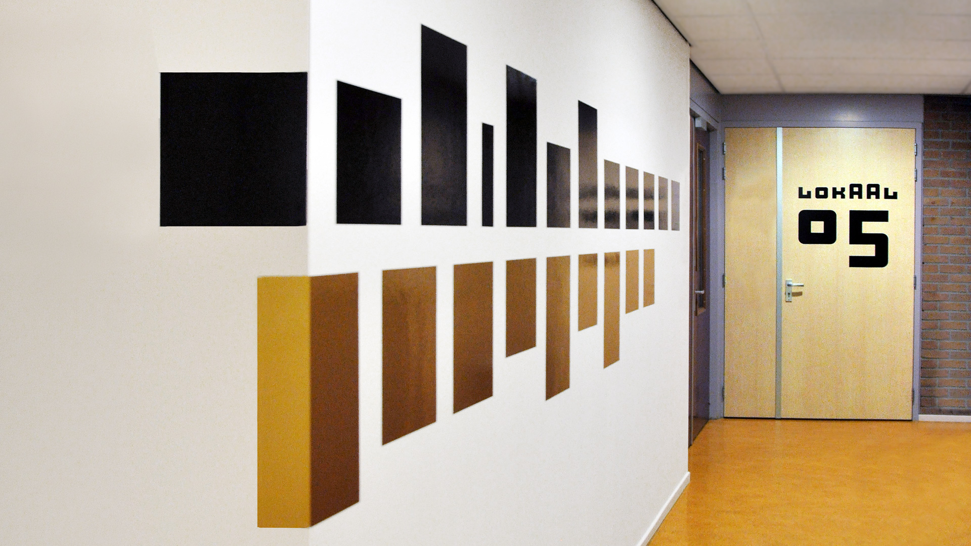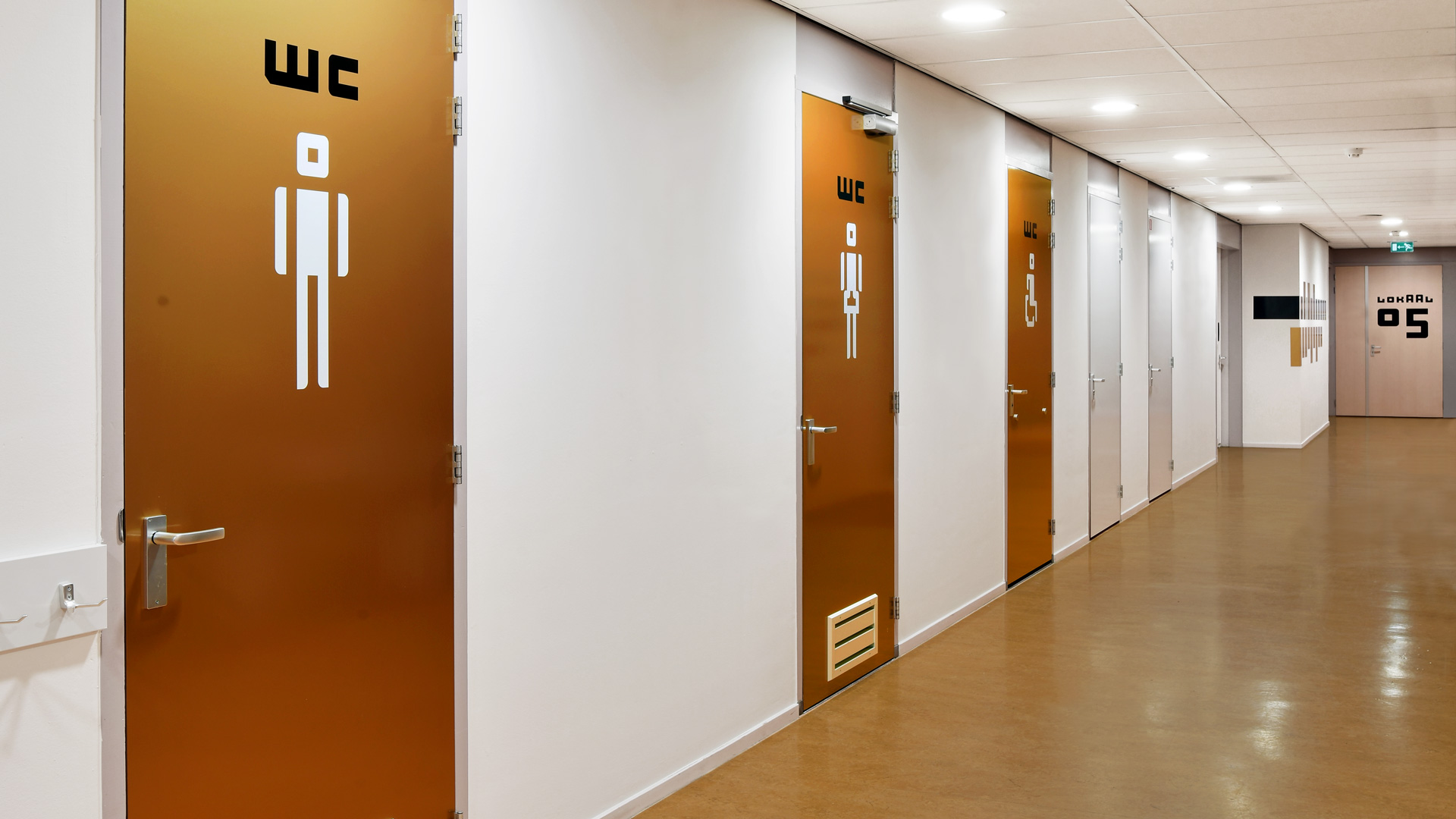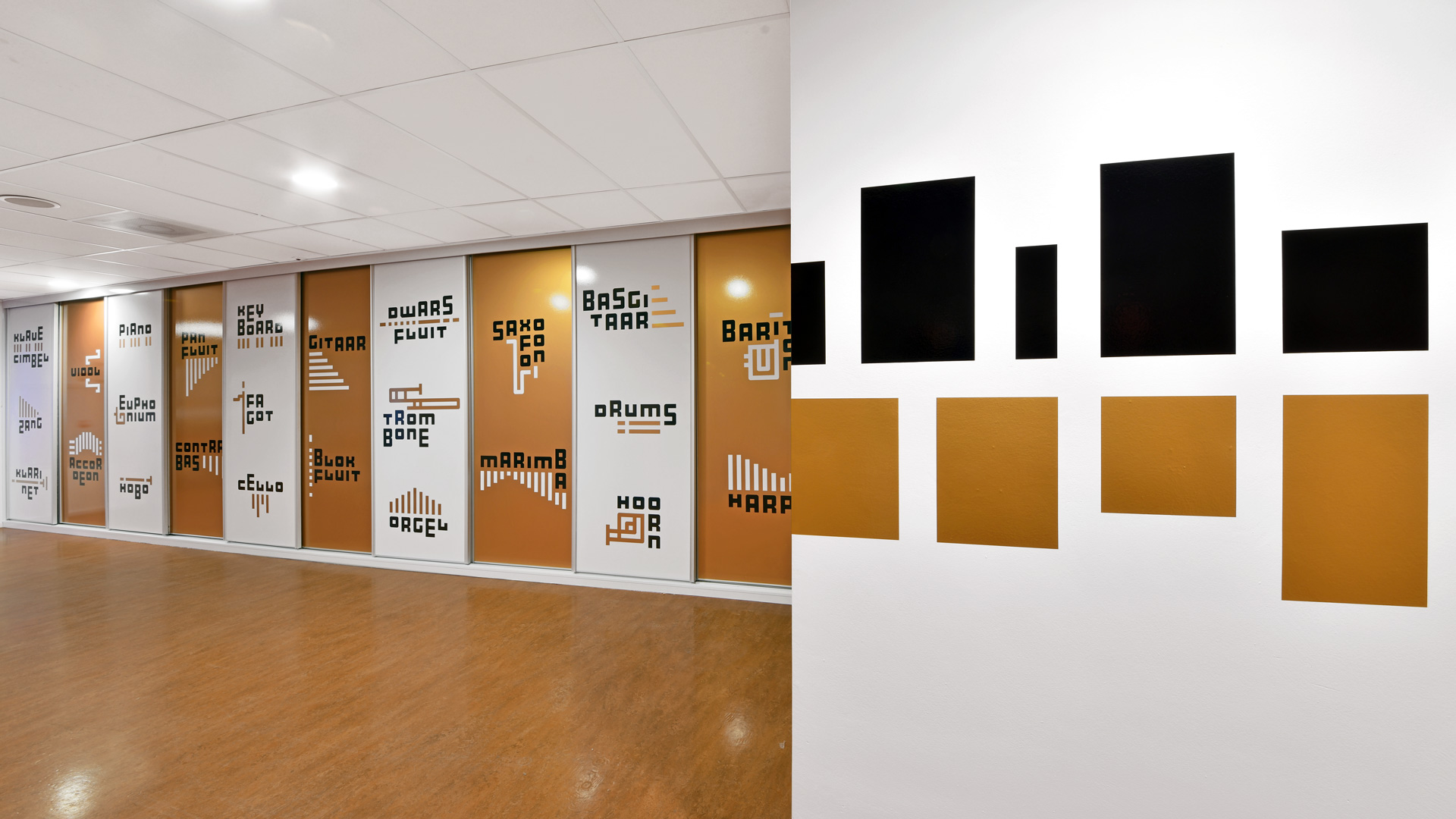 De huisstijl werd vervolgens doorgetrokken in het interieur van de muziekschool: een heldere en uitgesproken bewegwijzering aangebracht op deuren en muren, wc-deuren in de gouden huisstijlkleur met bijpassende iconen, bekleding in een bijpassende kleur. Op verschillende plekken komt de abstracte basisvorm van het logo terug, die doet denken aan een equalizer.