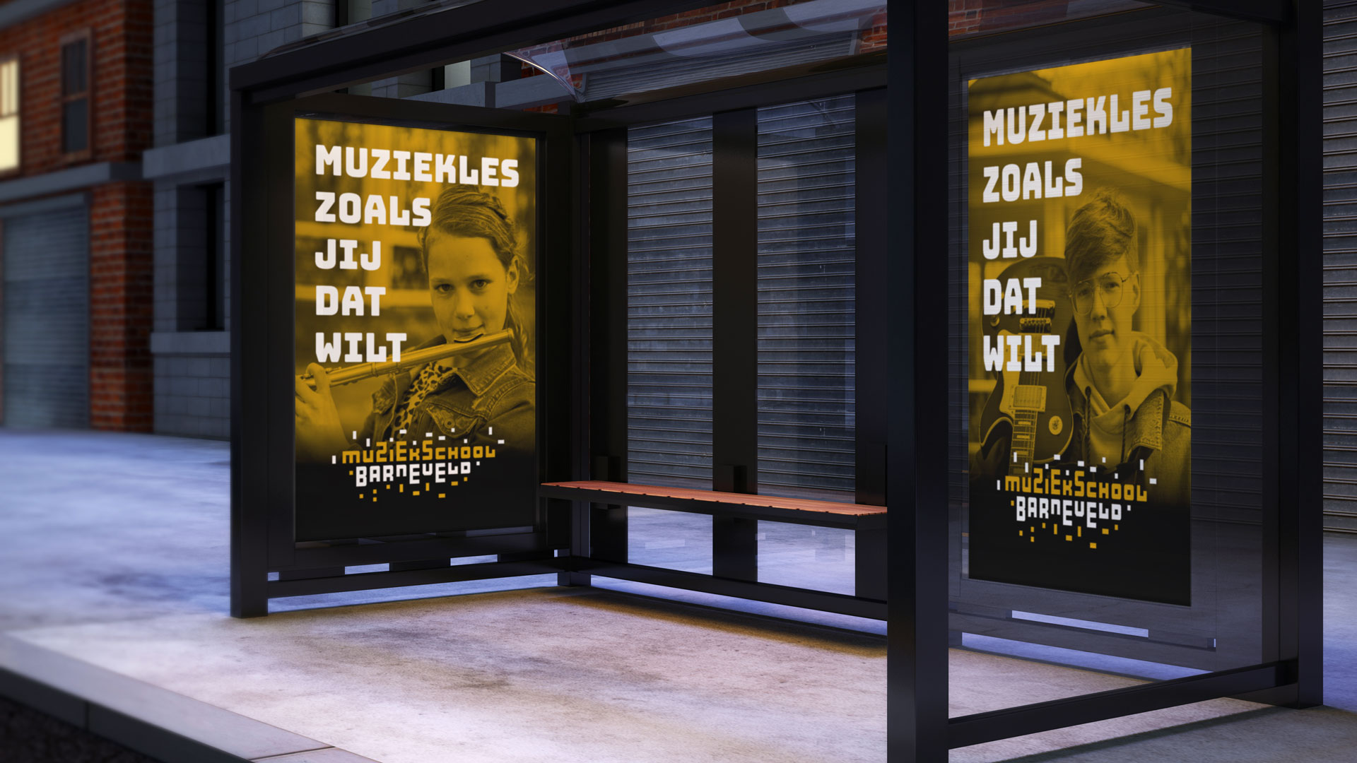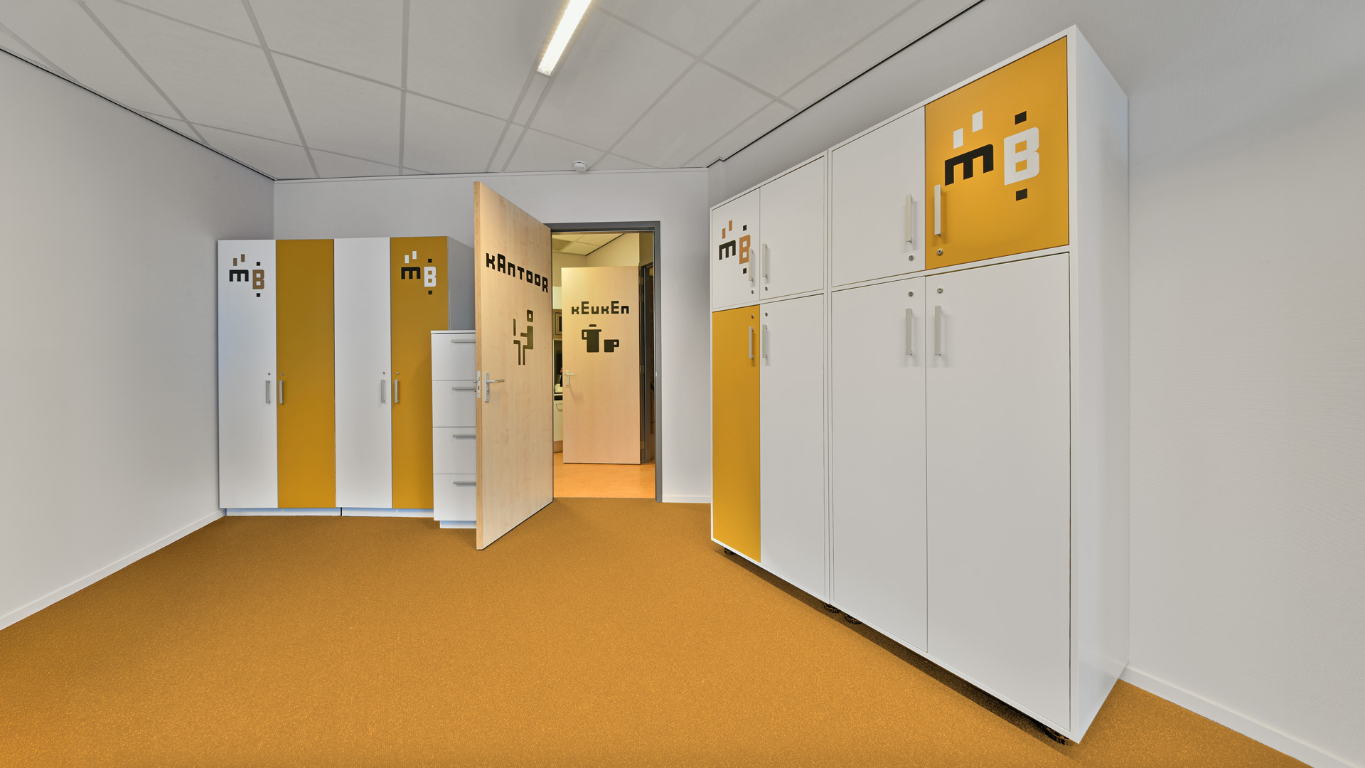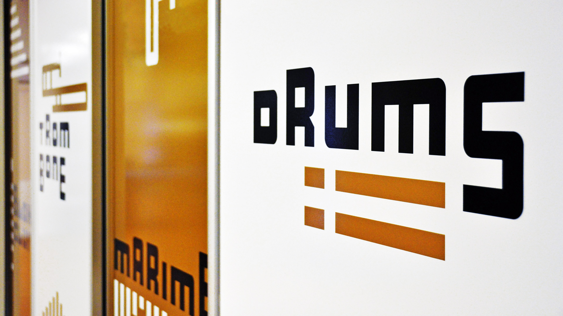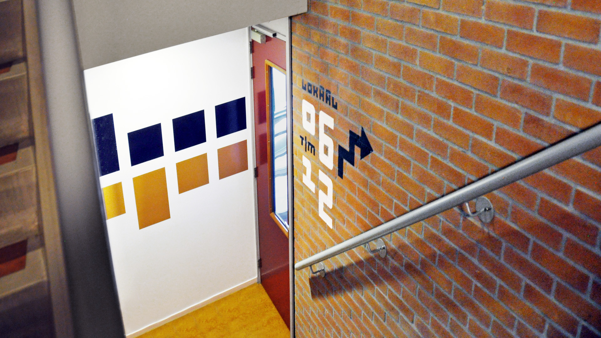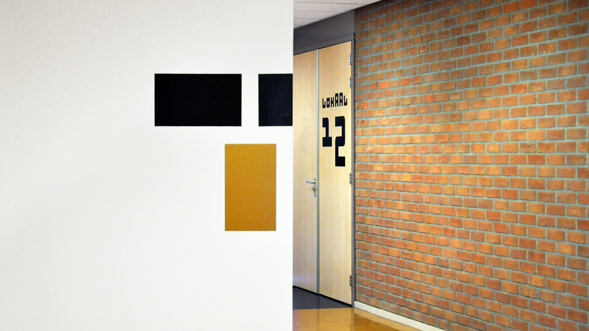 De huisstijl werd vervolgens doorgetrokken in het interieur van de muziekschool: een heldere en uitgesproken bewegwijzering aangebracht op deuren en muren, wc-deuren in de gouden huisstijlkleur met bijpassende iconen, bekleding in een bijpassende kleur. Op verschillende plekken komt de abstracte basisvorm van het logo terug, die doet denken aan een equalizer.