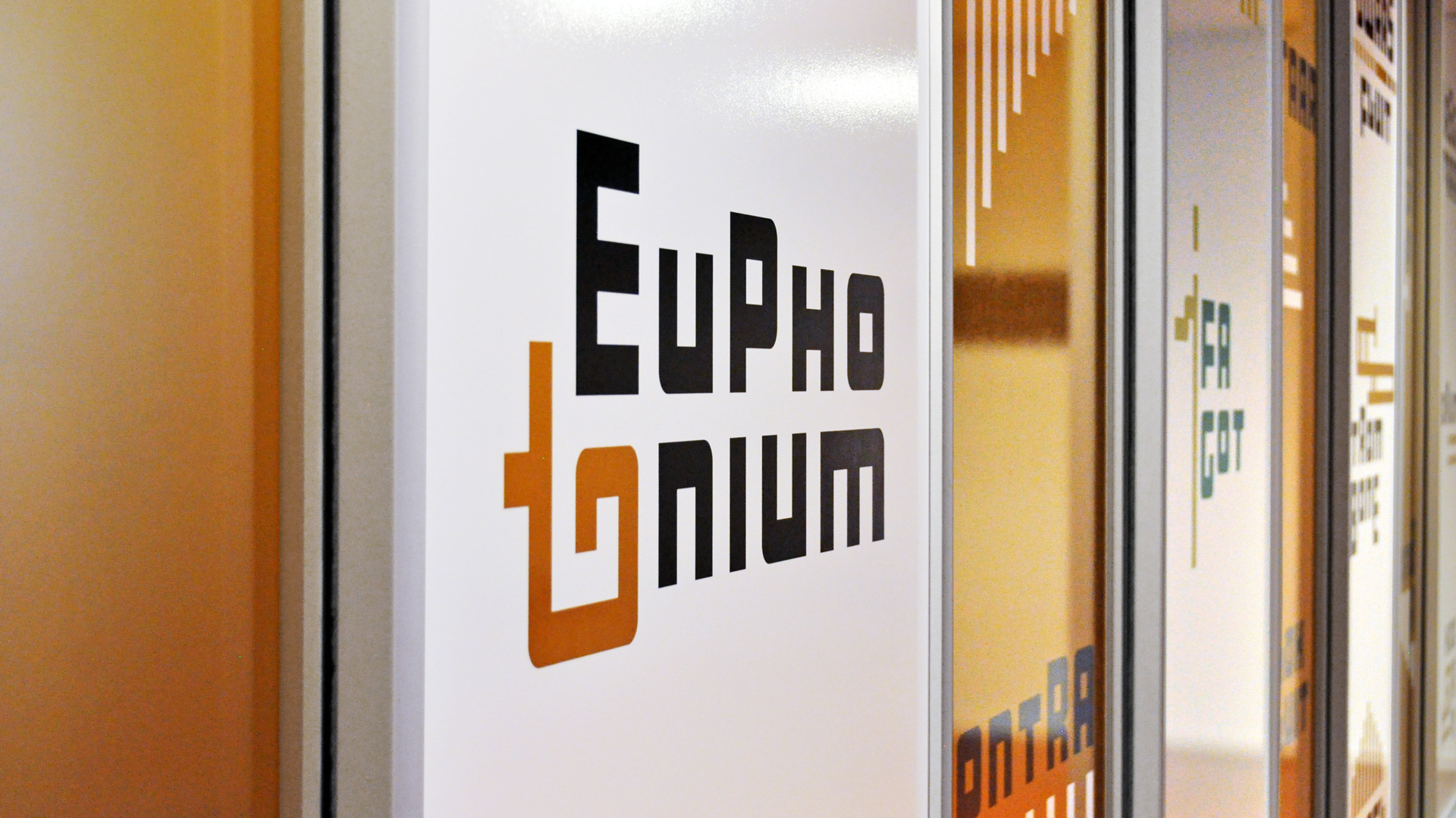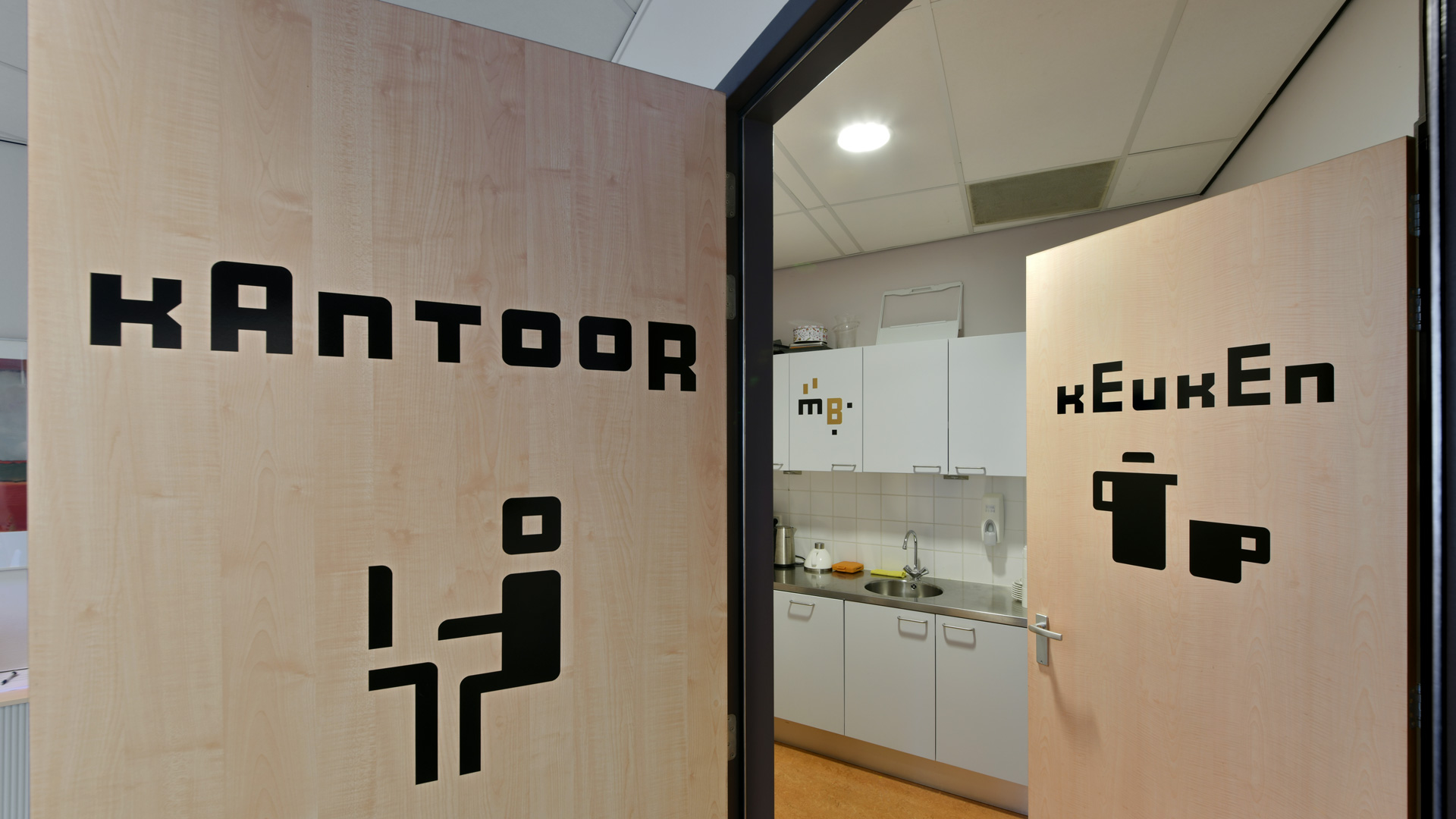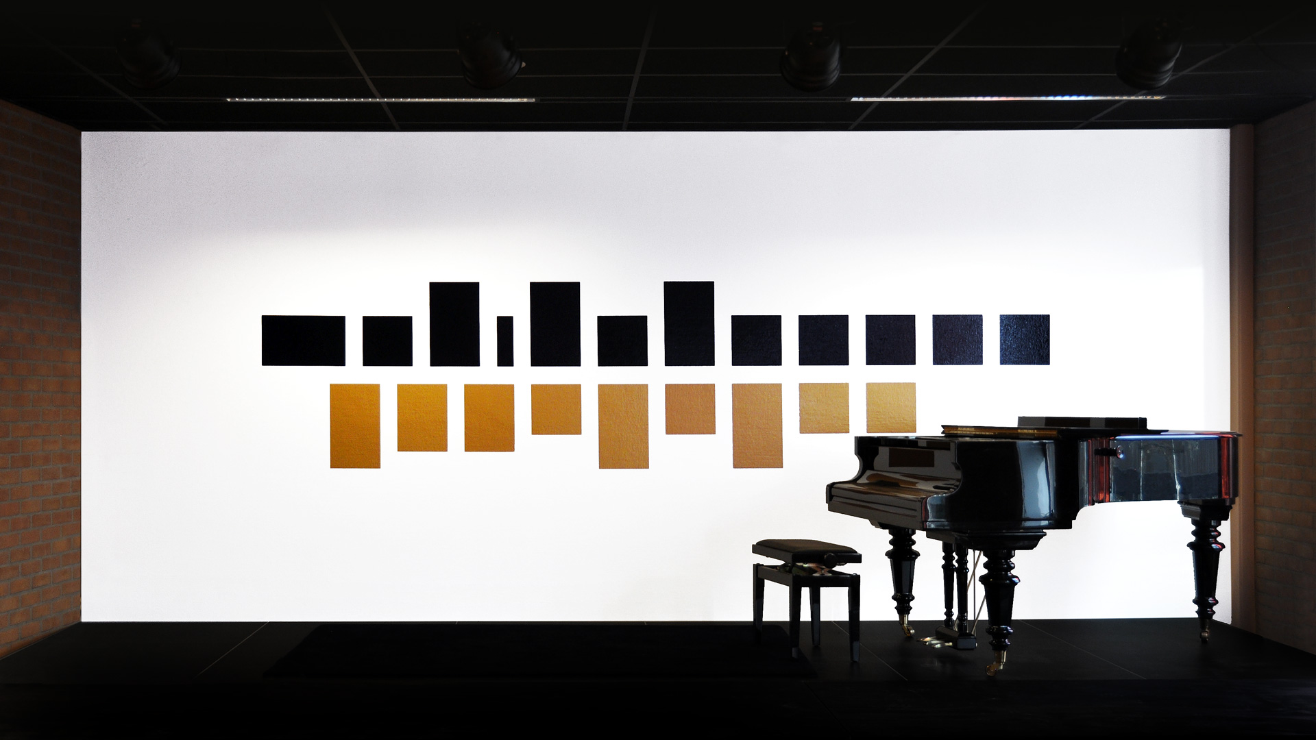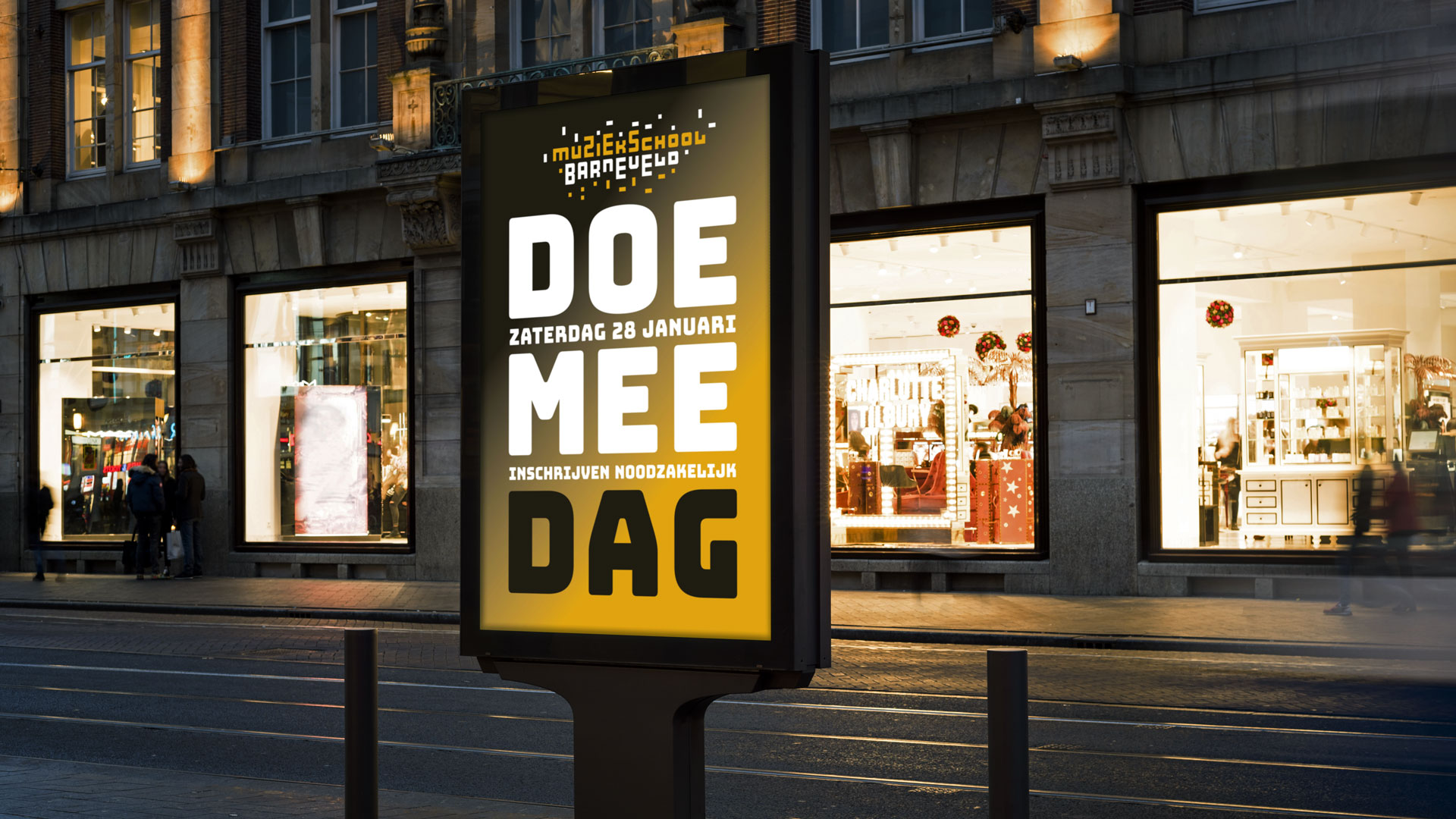 De huisstijl werd vervolgens doorgetrokken in het interieur van de muziekschool: een heldere en uitgesproken bewegwijzering aangebracht op deuren en muren, wc-deuren in de gouden huisstijlkleur met bijpassende iconen, bekleding in een bijpassende kleur. Op verschillende plekken komt de abstracte basisvorm van het logo terug, die doet denken aan een equalizer.