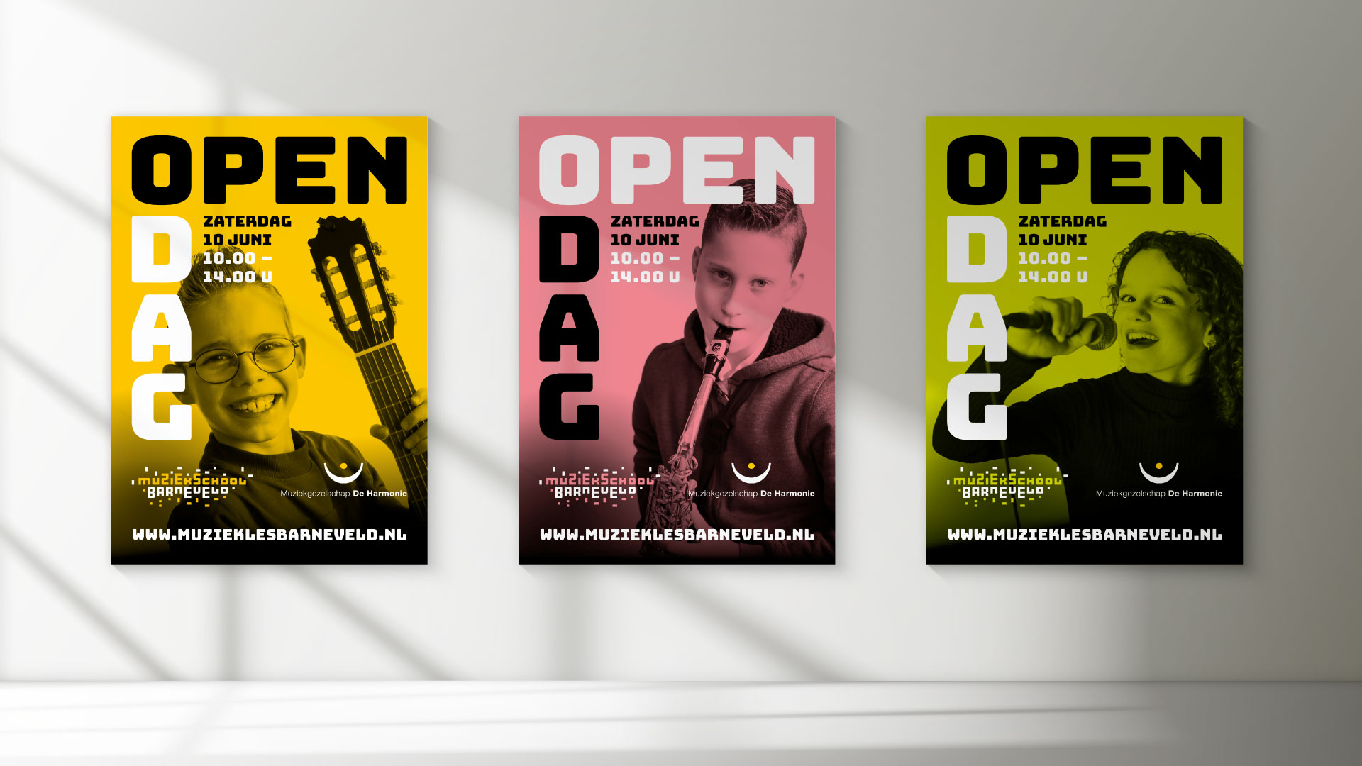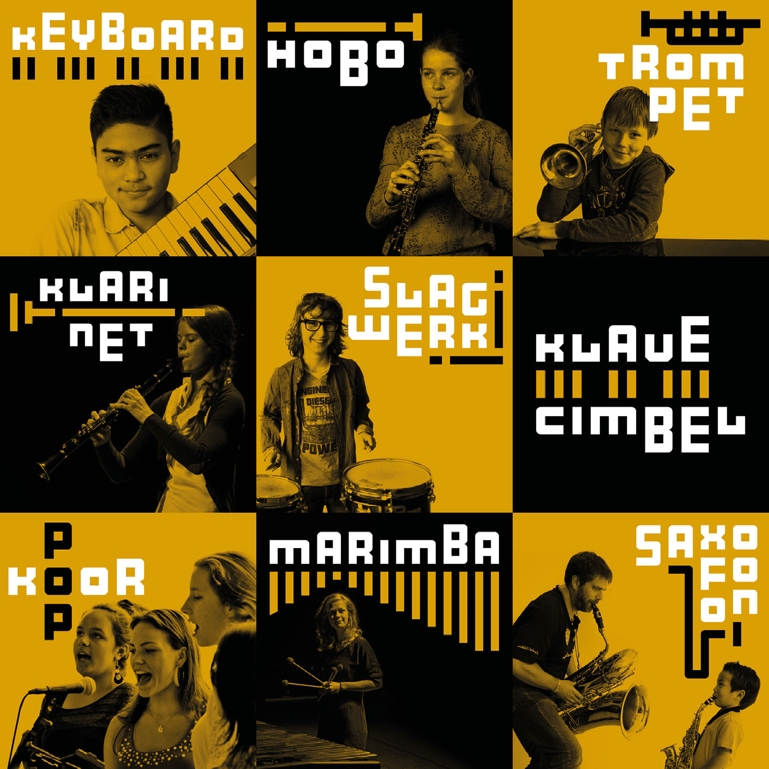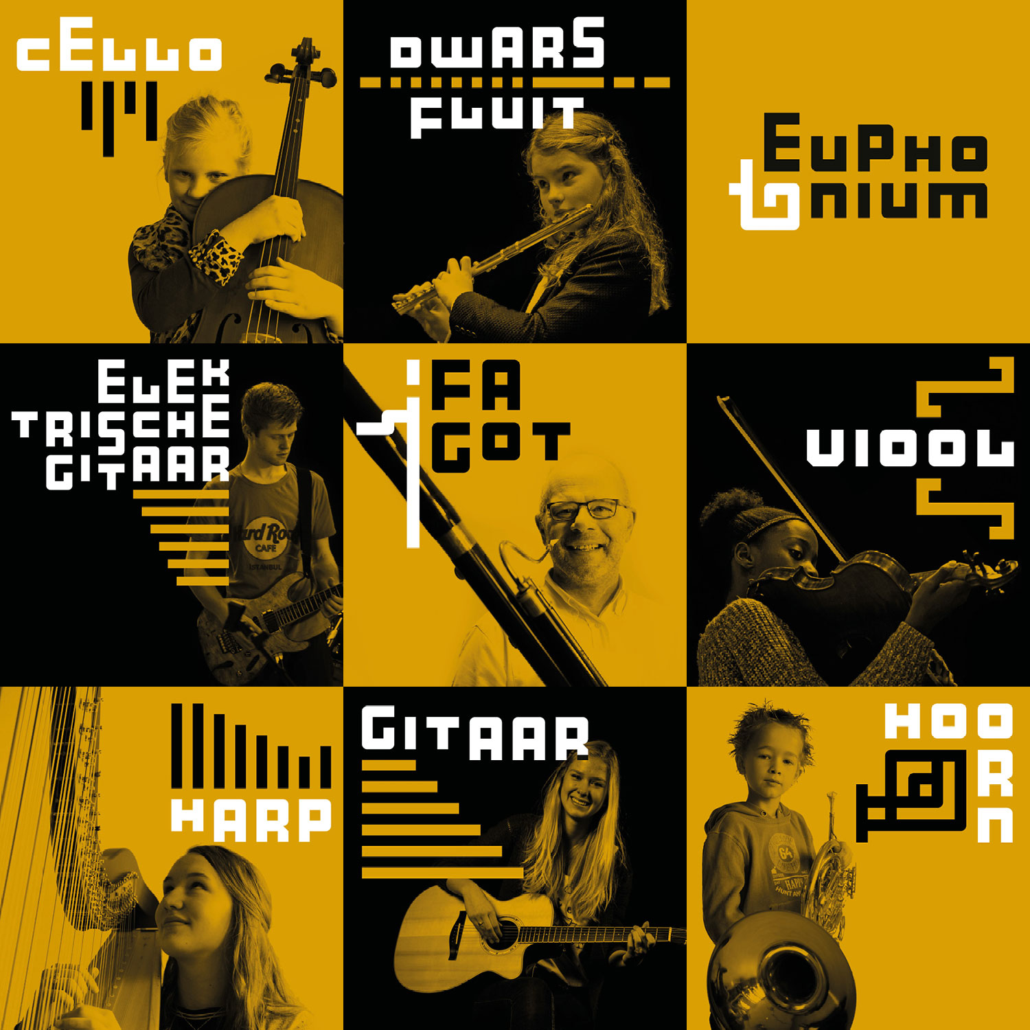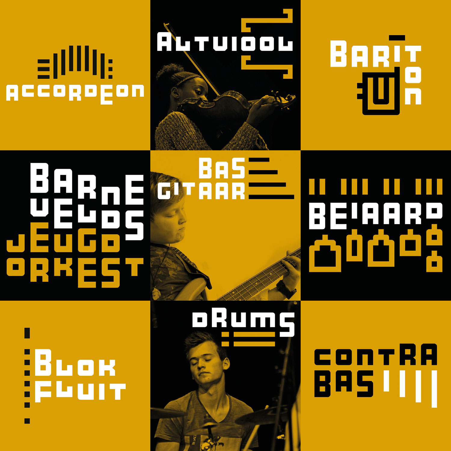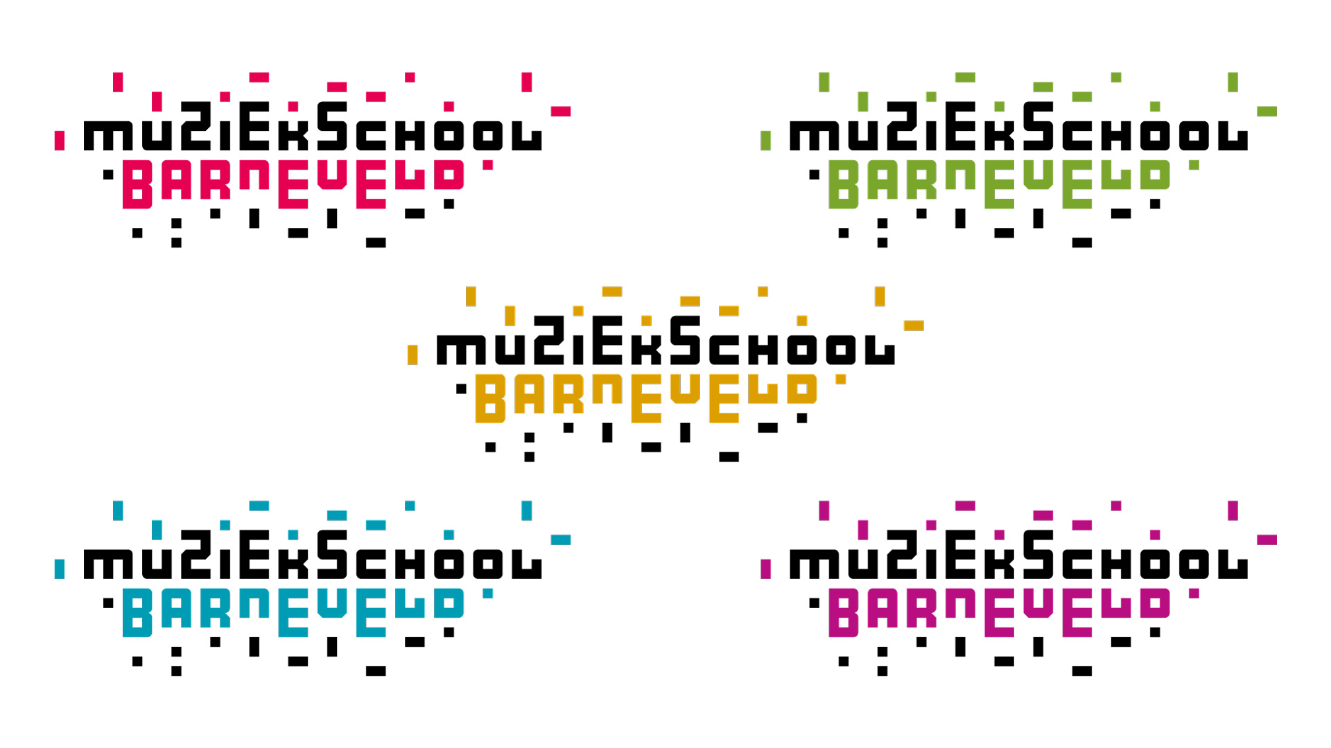 Muziekschool Barneveld vroeg Studio Hartebeest een nieuw logo met bijpassende huisstijl te ontwerpen. Wij ontwikkelden een ‘muzikaal lettertype’ vanuit een vierkante basisvorm. In iedere combinatie levert dit weer een nieuw samenspel op, zoals te zien is in de speelse verbeeldingen van de instrumenten.