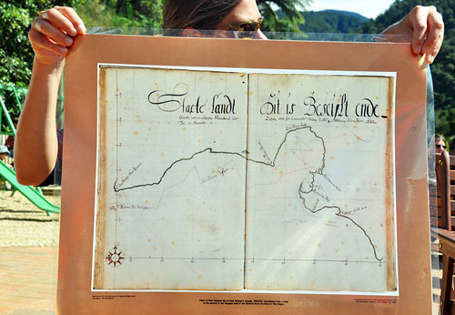 A copy of Abel Tasman’s map at the Anatoki Salmon Farm in Golden Bay (where we came across Staete Landt wine). Een kopie van Abel Tasman’s kaart bij de Anatoki Salmon Farm in Golden Bay (waar we Staete Landt wijn tegenkwamen).