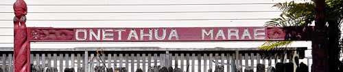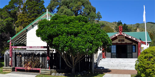 It is the home marae for three local iwi: Ngati Rarua, Ngati Tama and Te Ātiawa, but it operates as a multicultural marae with the wider involvement of the whole community. At the gate entrance there’s also a carving that tells of Ngāti Tūmatakōkiri, the tribe which was in occupation at the time Abel Tasman arrived in Mohua (Golden Bay). Het is de marae die geldt als thuisbasis voor drie locale iwi: Ngati Rarua, Ngati Tama en Te Ātiawa, maar het functioneert als een multiculturele marae waaraan de hele gemeenschap deelneemt. Bij de ingang is ook een houtsnede te zien die vertelt over Ngāti Tūmatakōkiri, de heersende stam in de periode dat Abel Tasman arriveerde in Mohua (Golden Bay).