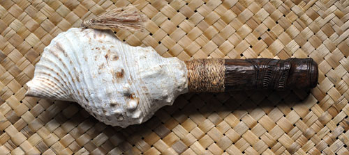 When visiting Robin Slow, he showed us a range of traditional Maori instruments, one of them being the pūtātara (shell trumpet). It is argued (for instance by Anne Salmond in Two Worlds) that the Ngati Tumatakokiri blew on a pūtātara when they met Abel Tasman. Tasman described it as ‘an Instrument which gave sound like the Moors’ Trumpets’. The combining of shell and wood (tied together with harakeke or pīngao) brings together Tāne and Tangaroa, the mighty Gods of Earth and Sea Beings. It signifies the importance of a peace offering (Brian Flintoff in Taonga Pūoro / Singing Treasures). Richard Nunns and Allan Thomas believe that the instrument used in the confrontation might have been the pūkaea, a long wooden trumpet. Tijdens ons bezoek aan Robin Slow liet hij ons een reeks aan traditionele Maori instrumenten zien, waaronder de pūtātara (schelptrompet). Er word gezegd (bijvoorbeeld door Anne Salmond in Two Worlds) dat de Ngati Tumatakokiri op een pūtātara bliezen toen zij Abel Tasman onttmoetten. Tasman beschreef het als ‘een Instrument, twelk geluit gaf als een der Moren Trompetten’. De combinatie van schelp en hout (verbonden door harakeke or pīngao) verbindt Tāne en Tangaroa, de machtige Goden van Aarde en Zeeleven. Het geeft het belang aan van het geven van een zoenoffer (Brian Flintoff in Taonga Pūoro / Singing Treasures). Richard Nunns en Allan Thomas geloven dat het gebruikte instrument in de confrontatie eerder een pūkaea was, een lange houten trompet.