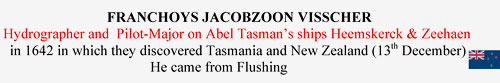 John Clarke (UK/NZ): “On my mother’s side my third name is Visger which is an anglicised version of Visscher. On my family tree I have FRANCHOYS JACOBZOON VISSCHER, Hydrographer and Pilot-Major on Abel Tasman’s ships Heemskerck & Zeehaen in 1642 in which they discovered Tasmania and New Zealand (13th December). He came from Flushing. My main line of the Visschers were the first settlers in Nieuw Amsterdam which at the Treaty of Breda (1667) was exchanged with England for the Island of Run!”
