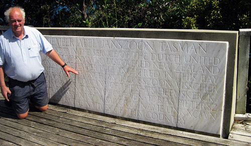 John Clarke visiting the Abel Tasman memorial, December 2012, pointing at ancestor!